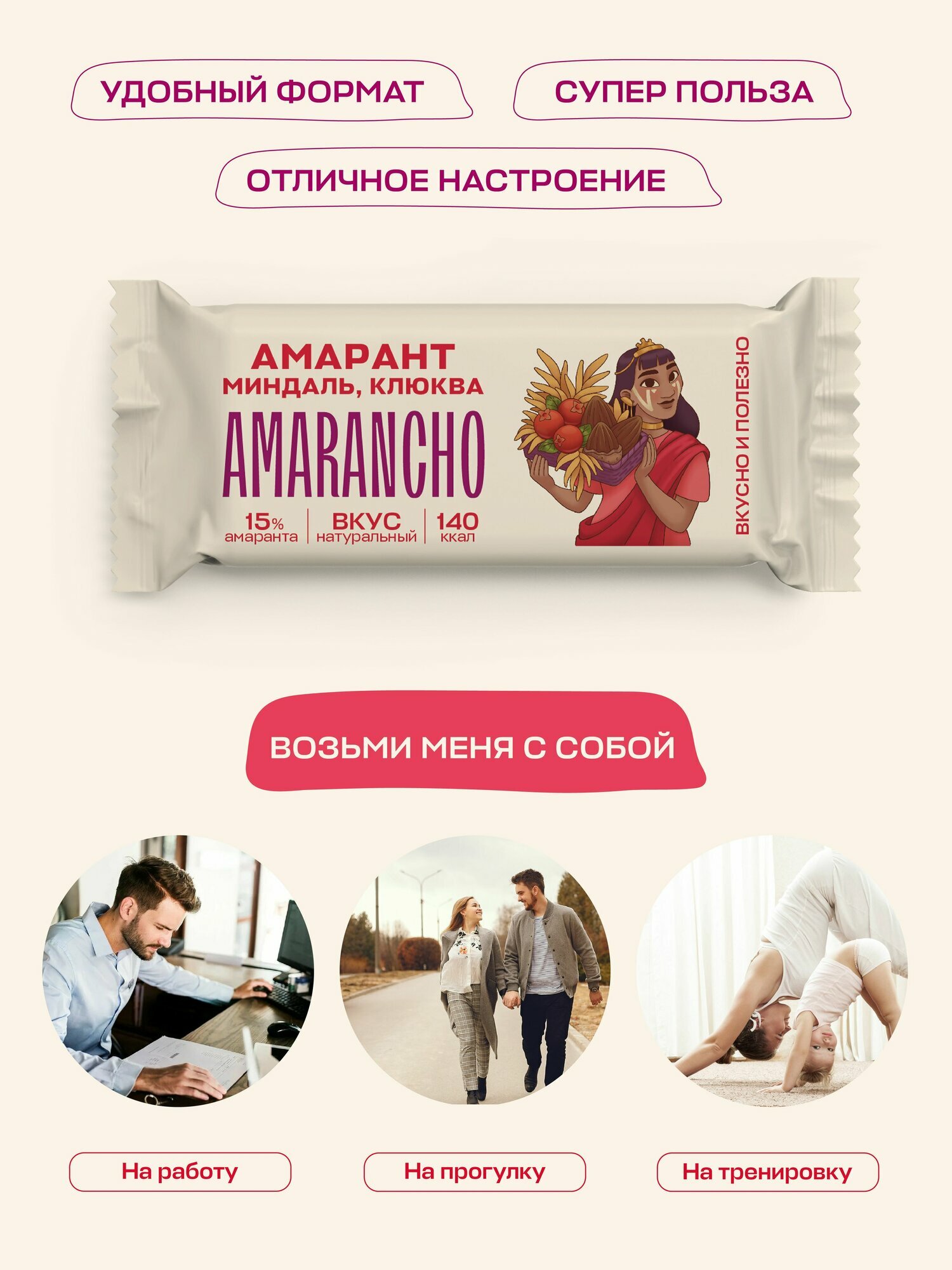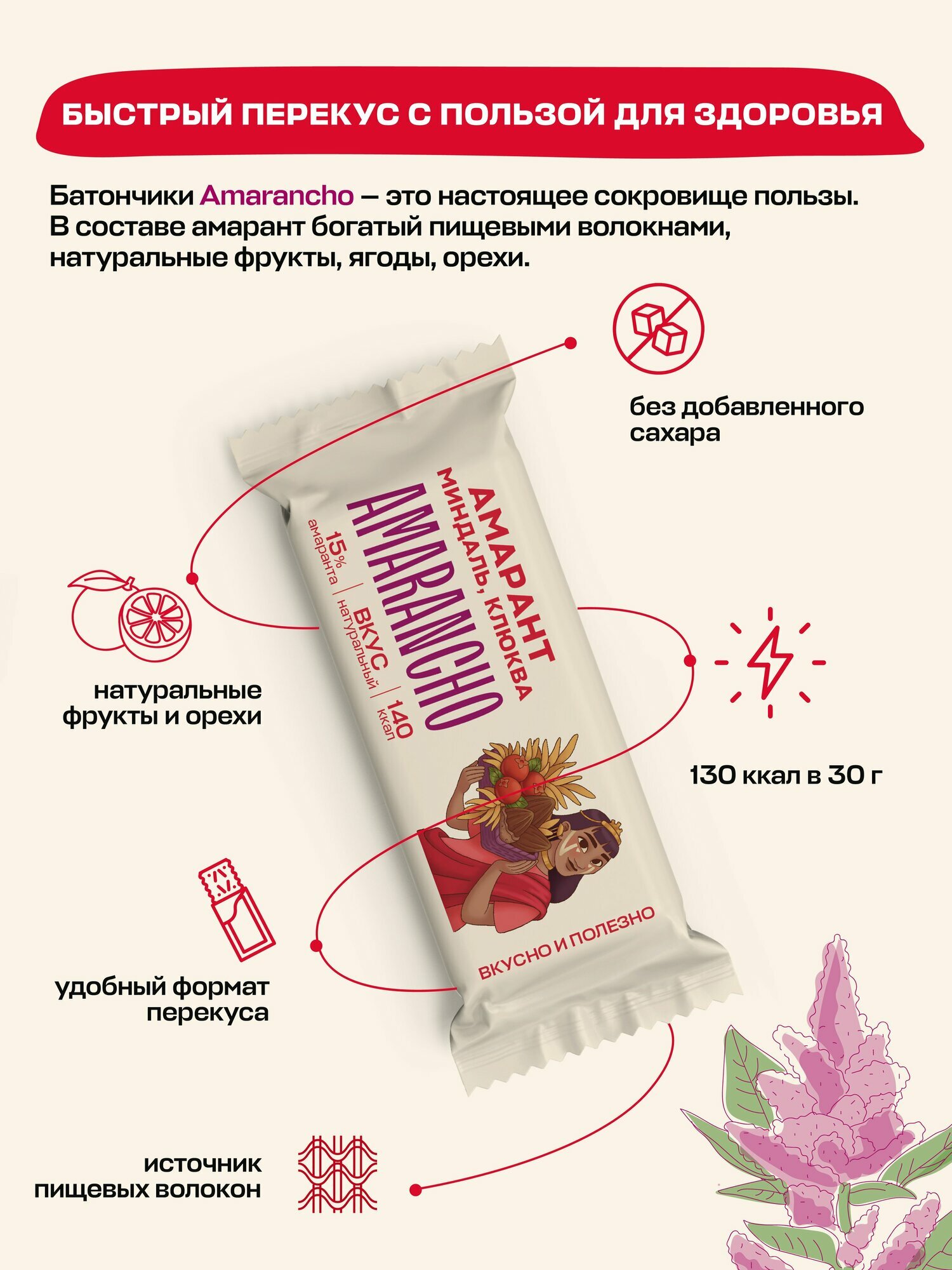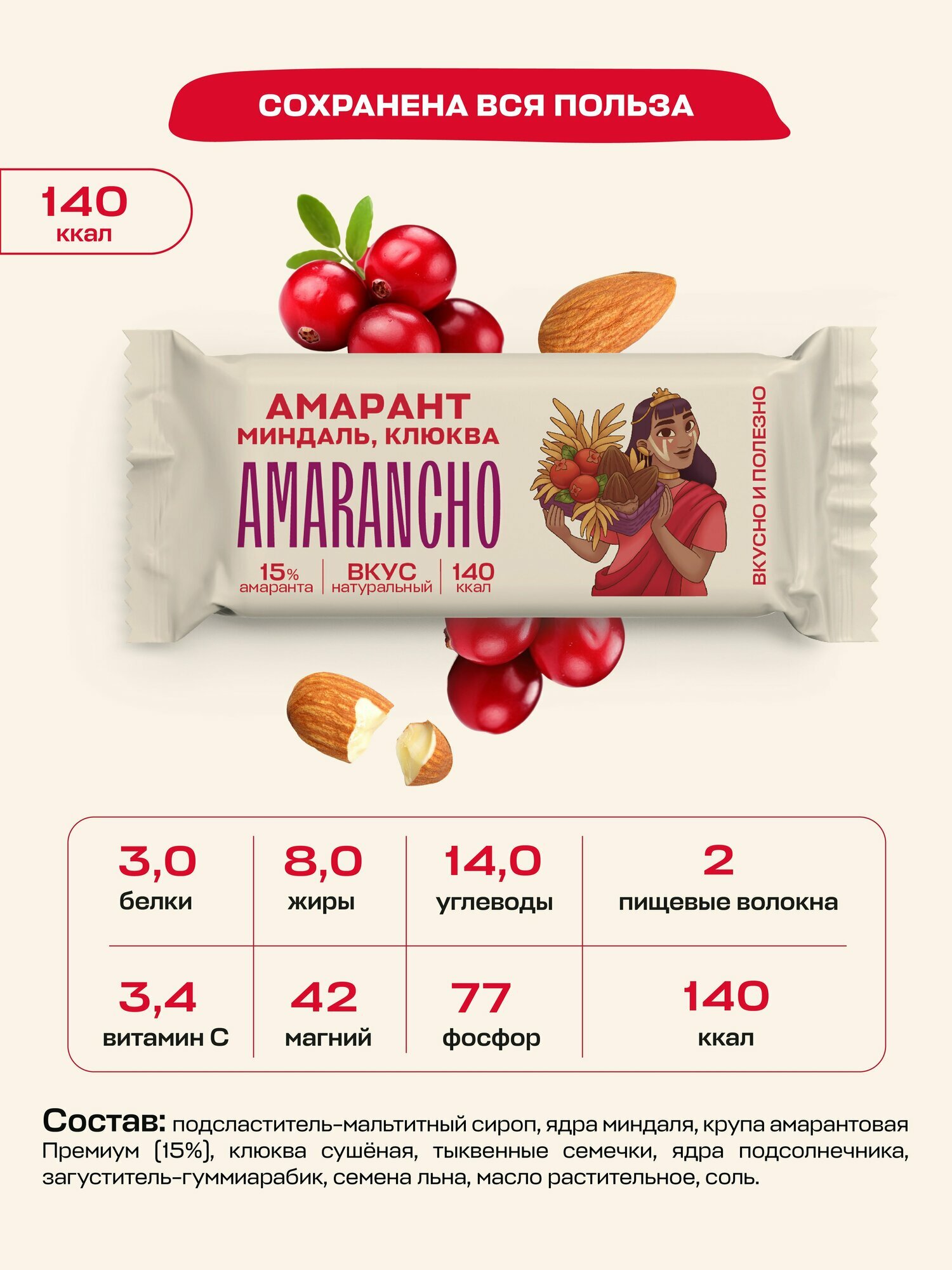 Батончики фруктово-зерновые "Amarancho", амарант, миндаль, клюква, мюсли без сахара, 9 шт интересное: