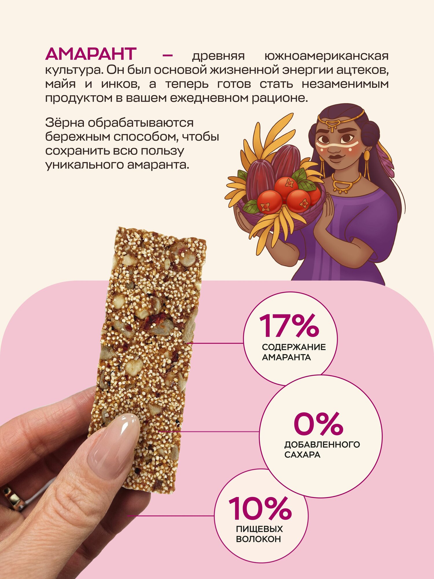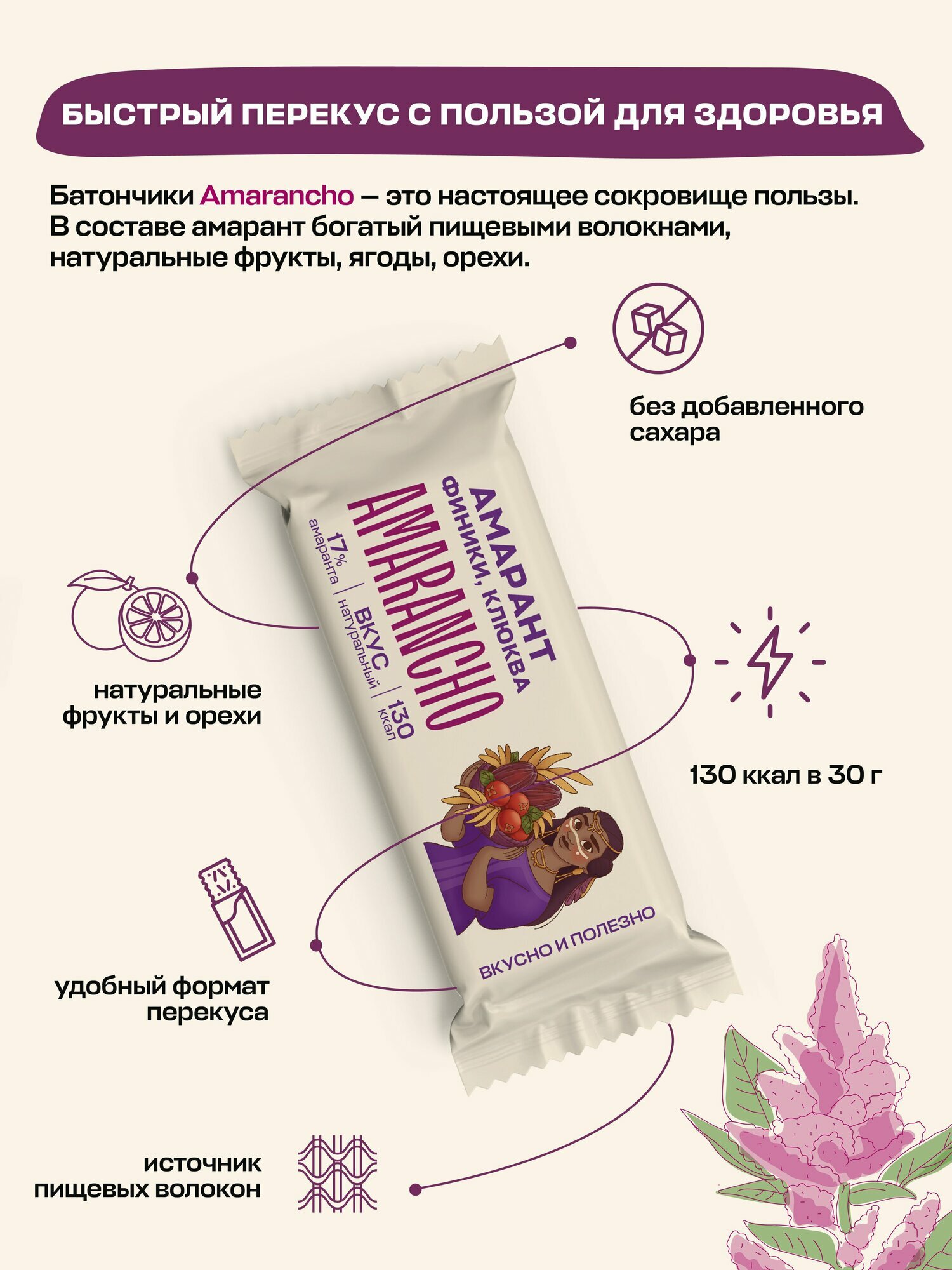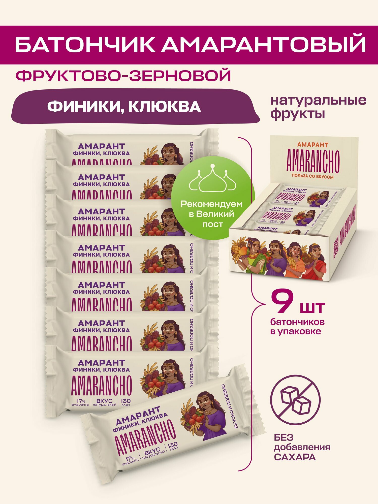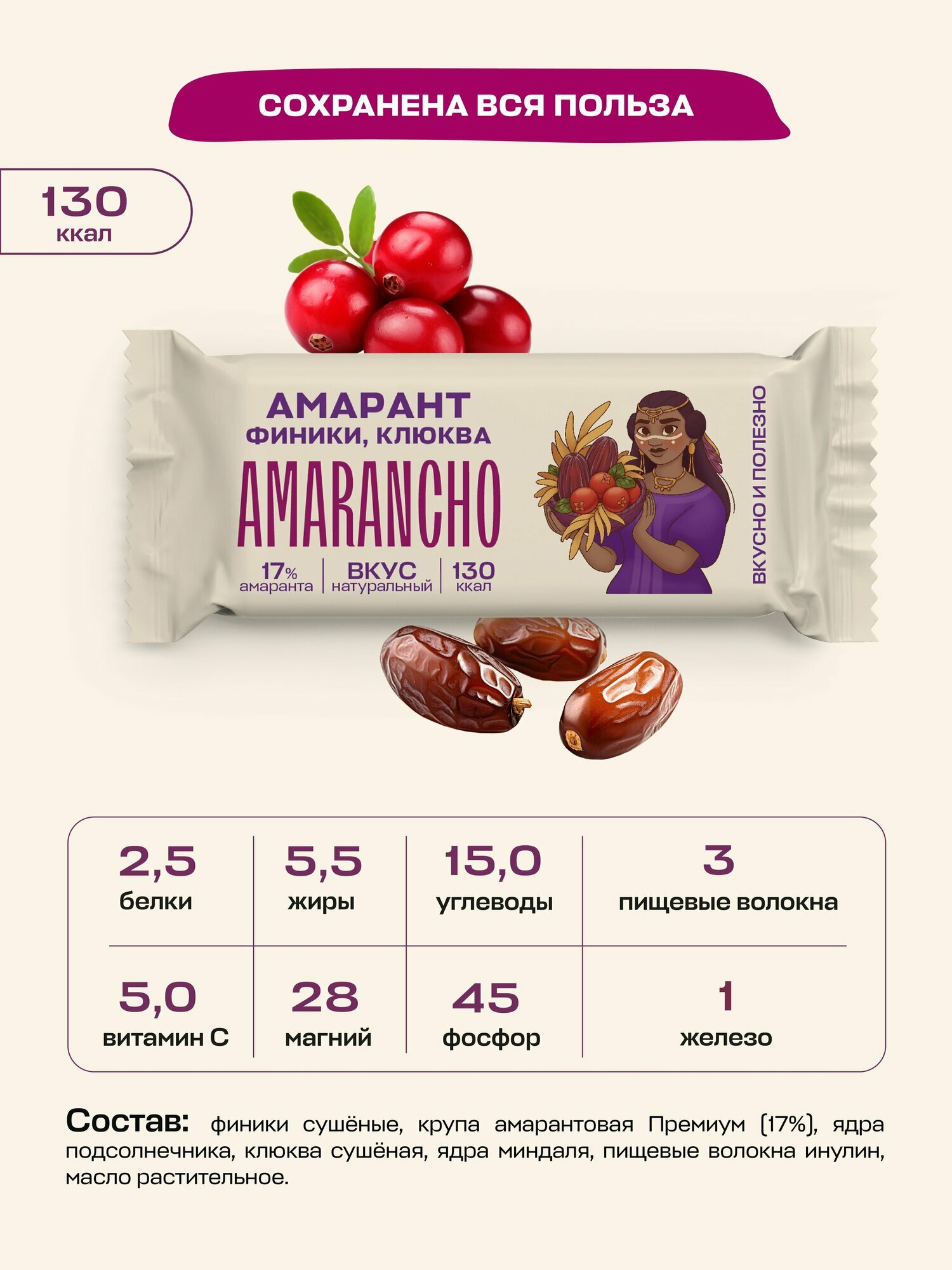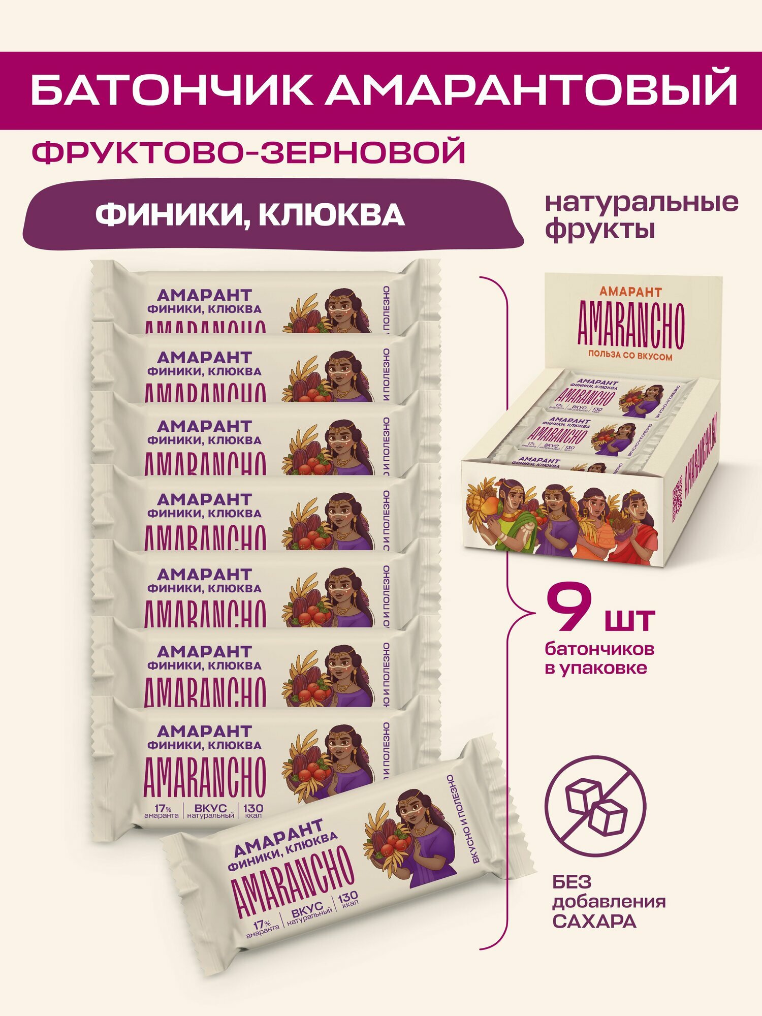 Батончики фруктово-зерновые "Amarancho", амарант, финики, клюква, мюсли без сахара, 9 шт. интересное: