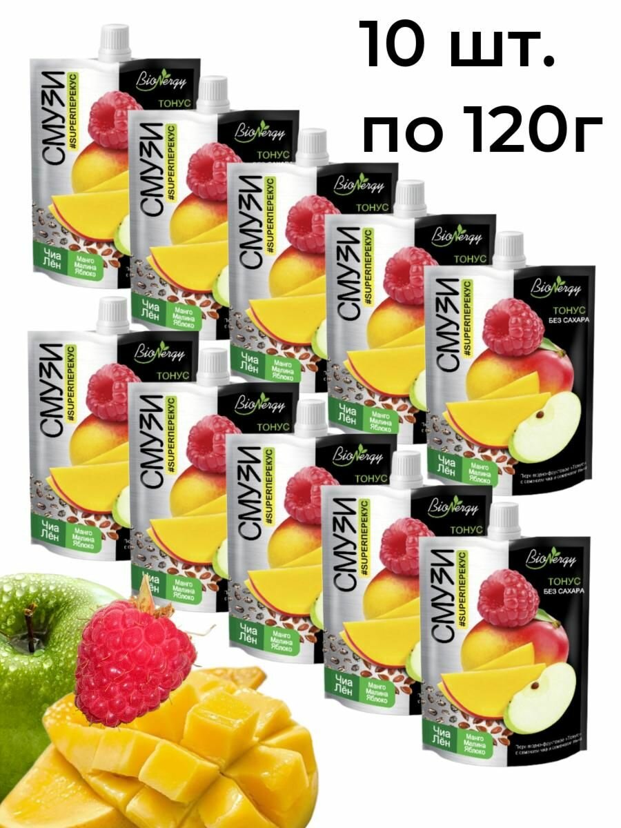 Купить Смузи Тонус без сахара Чиа, лен (манго, малина, яблоко) BioNergy, 10 шт по 120 гр