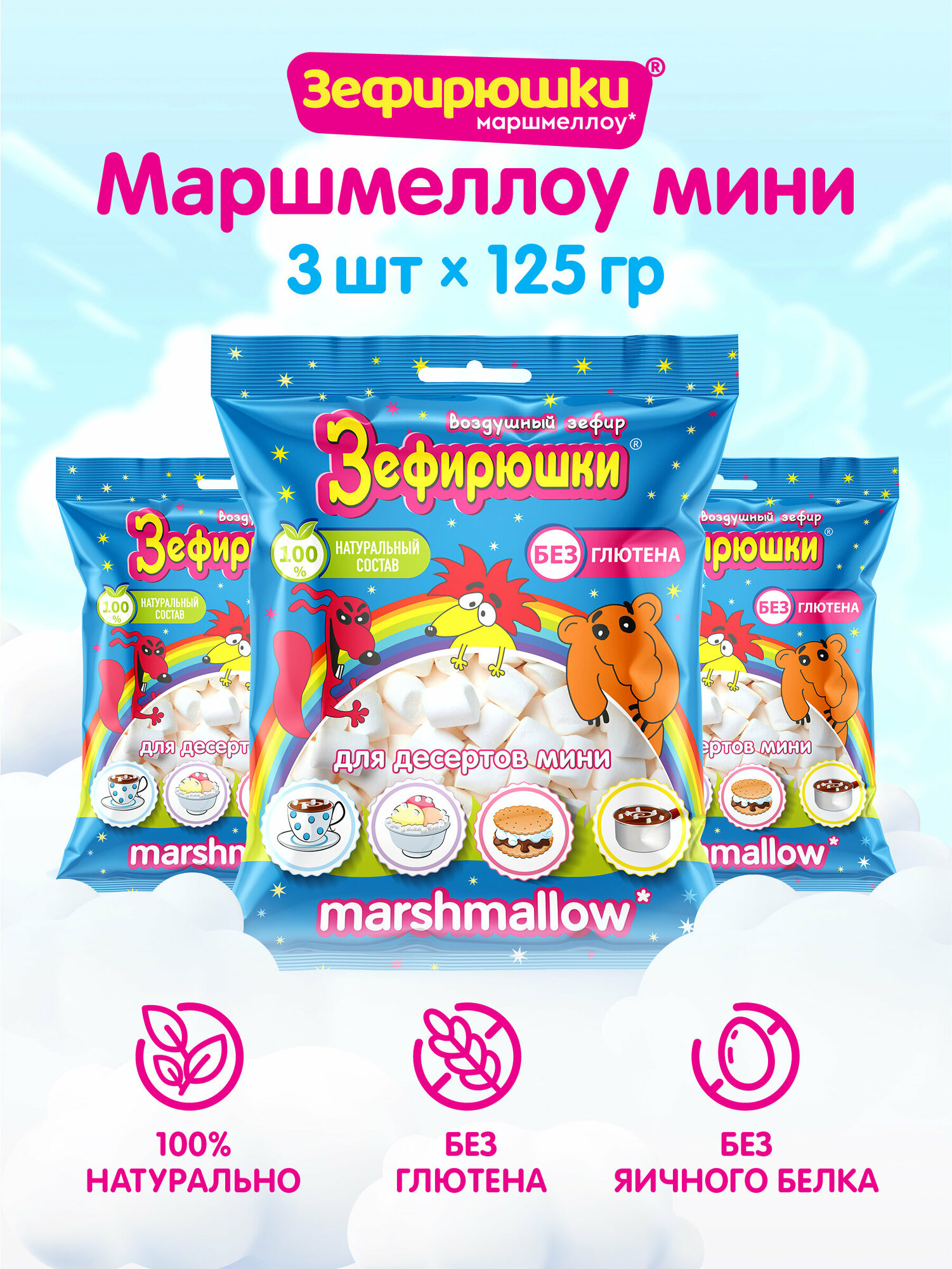 Купить Воздушный зефир для десертов Зефирюшки, без глютена, 3 шт по 125 г.