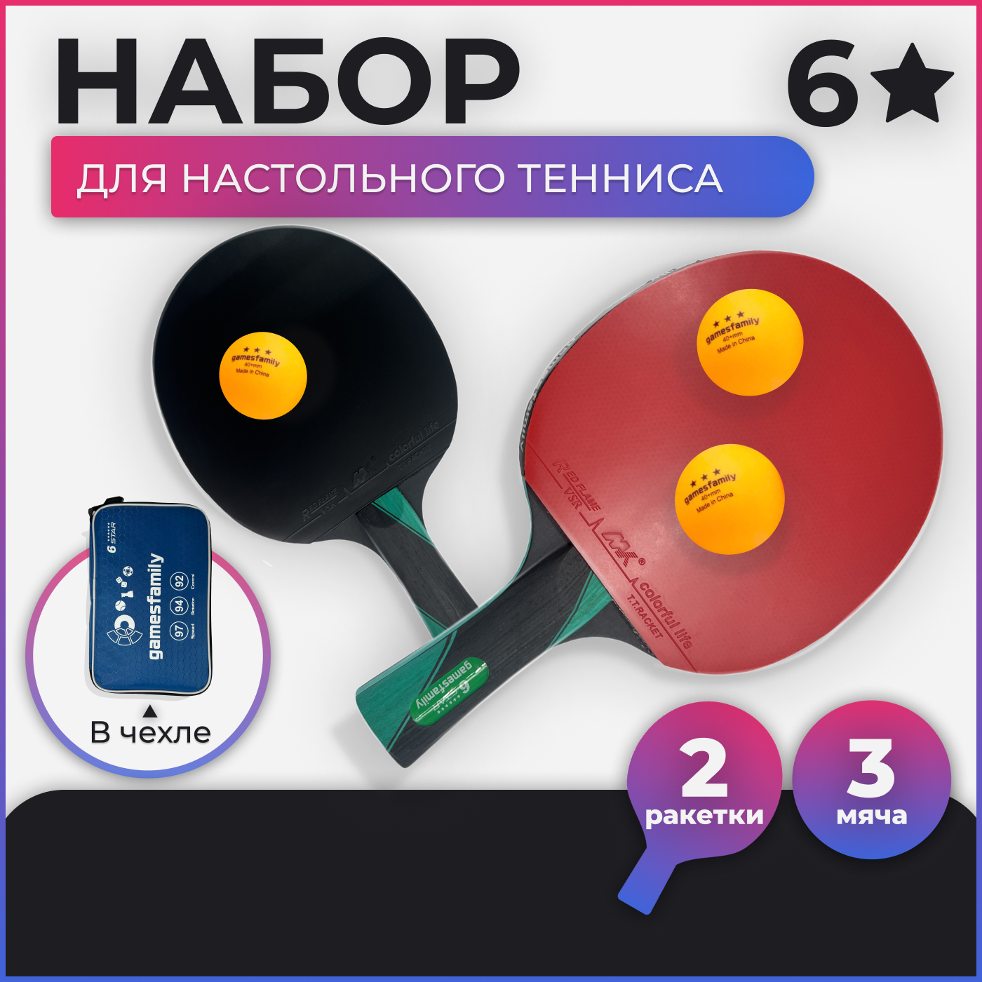 Gamesfamily Набор для настольного тенниса: 2 полупрофессиональных ракетки, 3 белых мячика 40+мм и черная водонепроницаемая сумка-переноска с ручкой на молнии