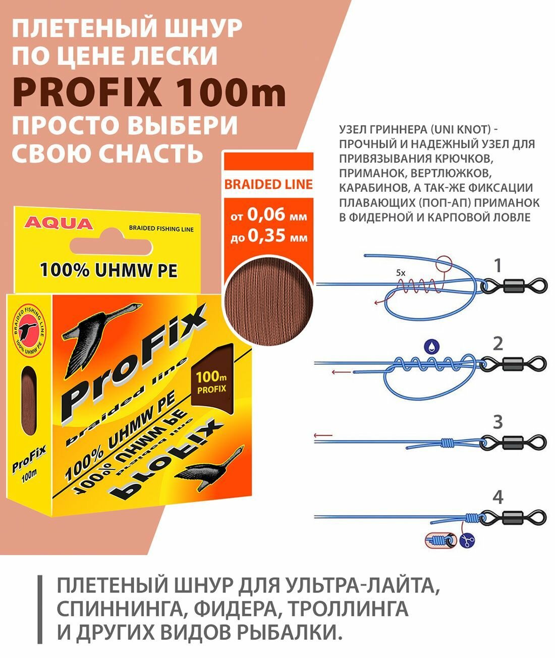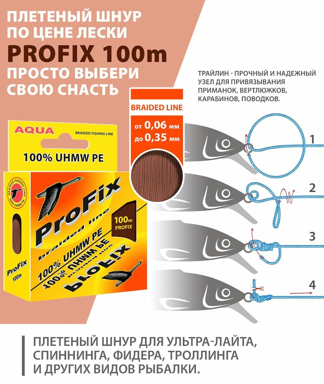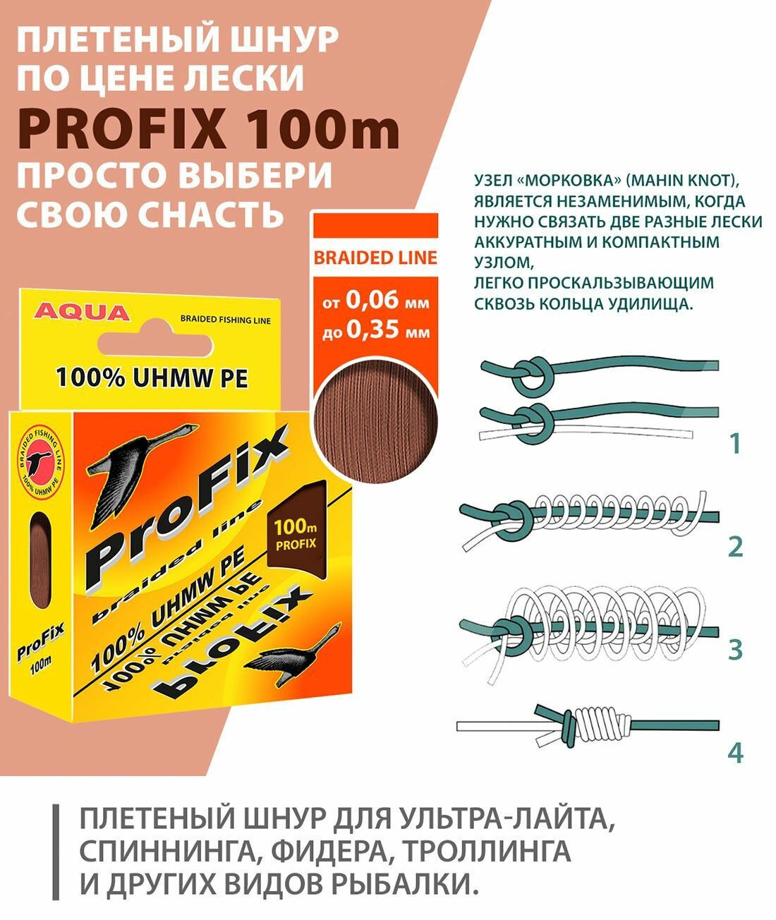 Ниже Вы можете прочитать отзывы на Плетеный шнур для рыбалки AQUA ProFix Brown 0,06mm 100m, ознакомится с подробными характеристиками, посмотреть интересные обзоры и фотографии на Плетеный шнур для рыбалки AQUA ProFix Brown 0,06mm 100m.