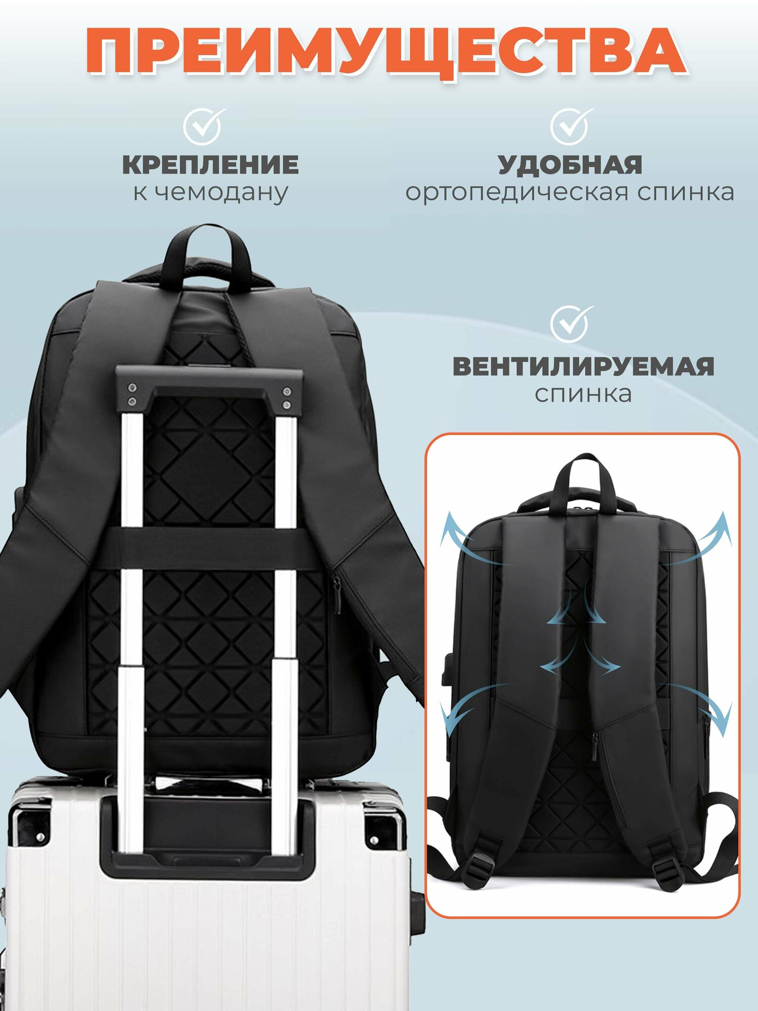 | Предметы | карман для бутылки, карман для документов, карман для планшета, карман для телефона, крепление на тележку / на чемодан, отделение для документов, отделение для ноутбука, подвесная петля |