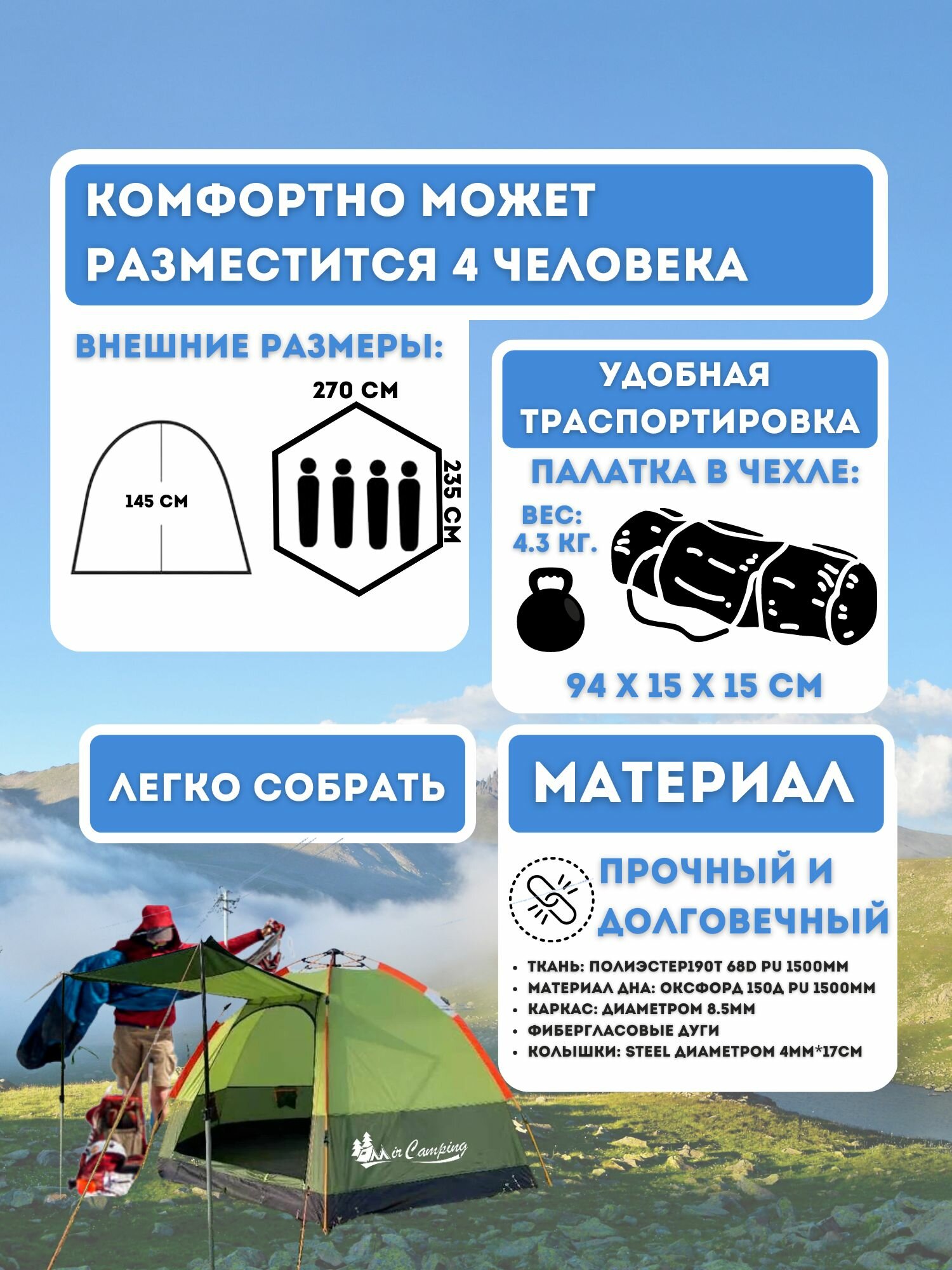 палатка туристическая 4 местная с полом, автоматическая, для рыбалки, шатер детский Mircamping950-4