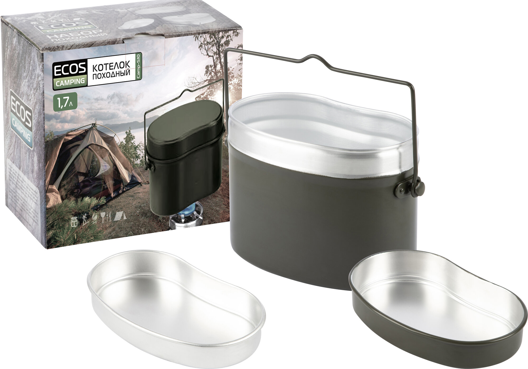 Купить Котелок походный 3 в 1 (котелок + 2 крышки - тарелки) Ecos Camp-S10, алюминий, 1.7 л