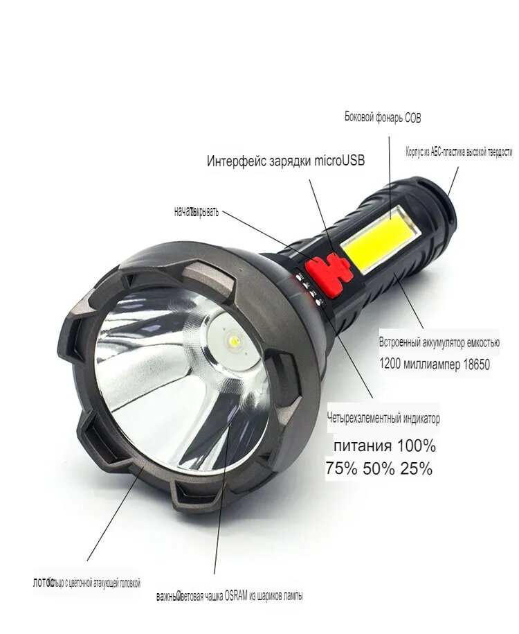 Фонарь туристический прожектор, световой поток 1000 люмен, дальность 500м, USB-заряд