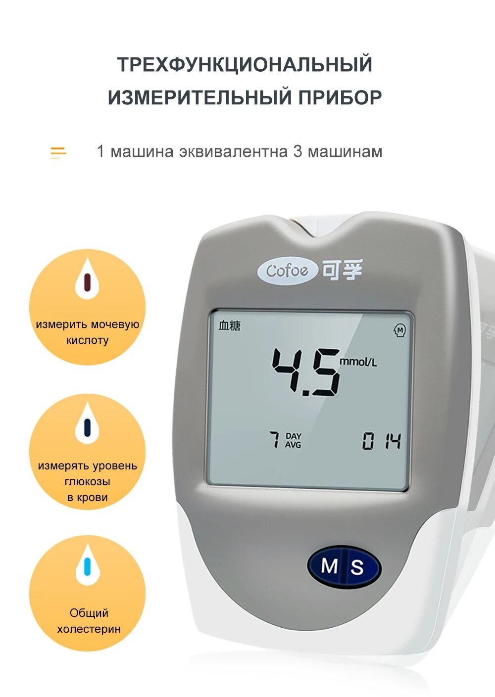 Монитор глюкозы крови Cofoe 3 в 1, one meter