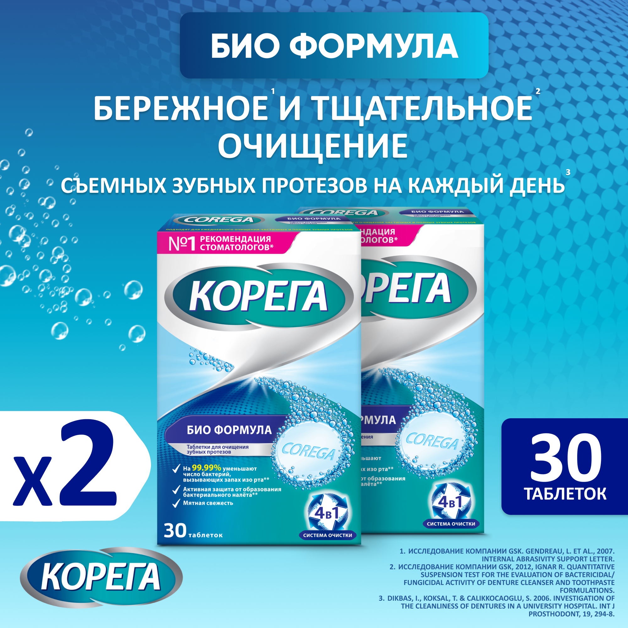 Корега Био Формула таблетки для очищения зубных протезов от стойких пятен и для активной защиты от образования налета, мятная свежесть, 30 шт*2