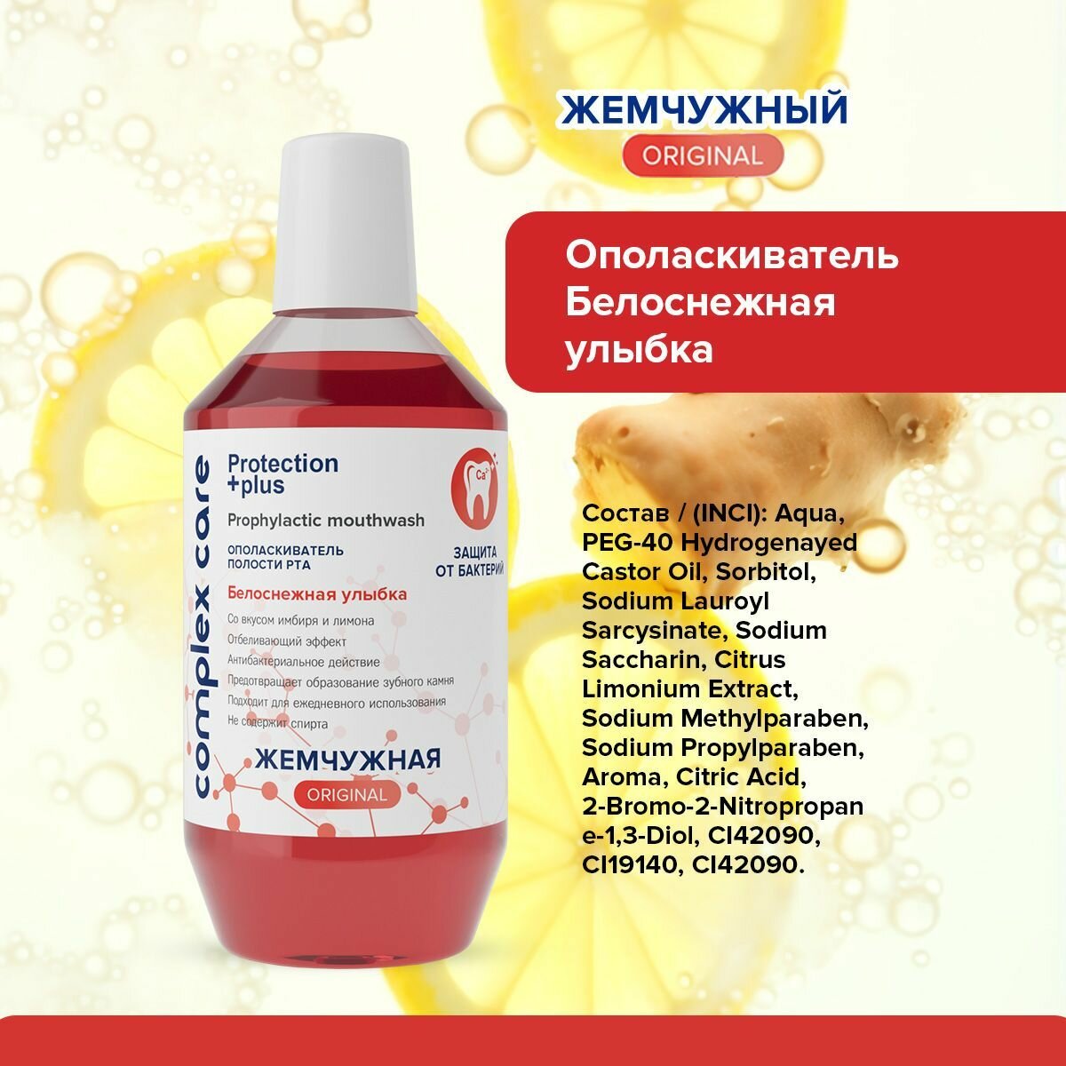 | Состав | Aqua, PEG-40 Hydrogenayed Castor Oil, Sorbitol, Sodium Lauroyl Sarcysinate, Sodium Saccharin, Citrus Limon Fruit Extract, Sodium Methylparaben, Sodium Propylparaben, Aroma, Citric Acid, 2-Bromo-2-Nitropropane-1,3-Diol, E-133. |