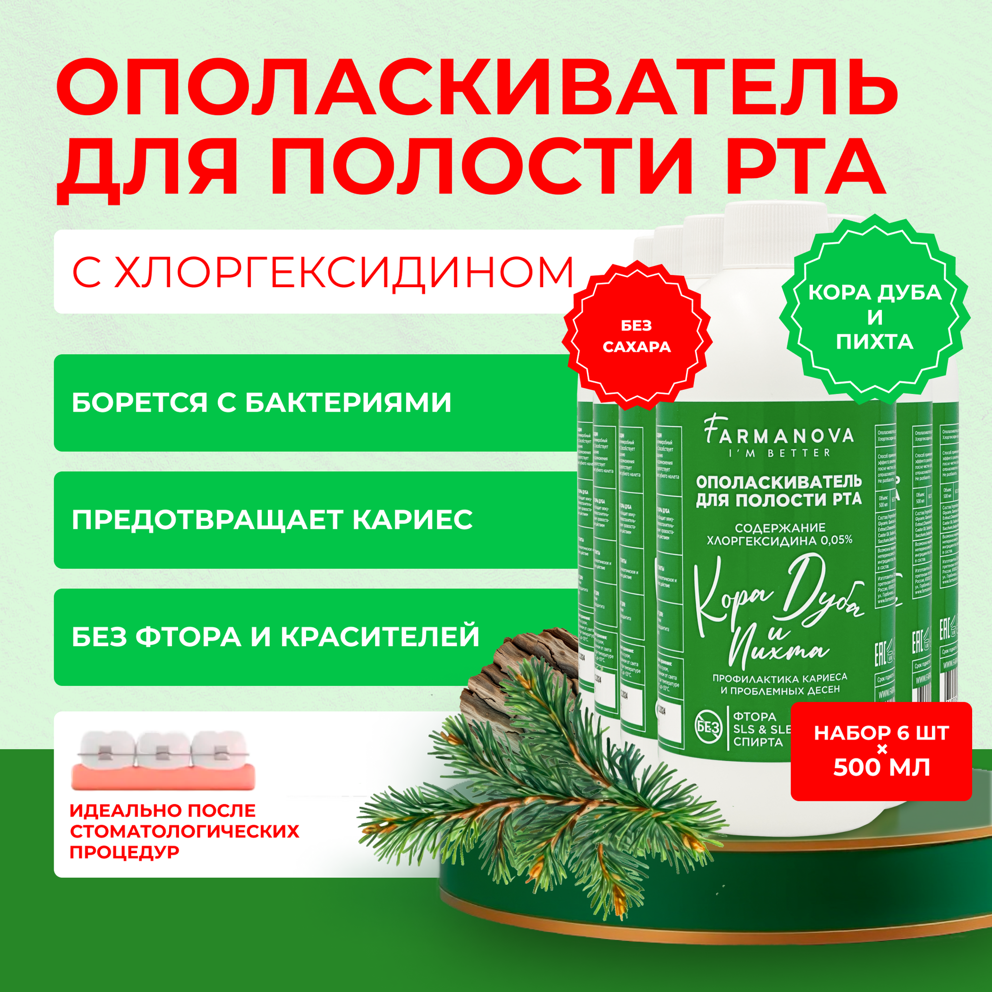 Купить 500 мл х 6 шт. Ополаскиватель для полости рта хлоргексидин 500 мл со вкусом Коры Дуба и Пихты/ Ополаскиватель / Для полости рта