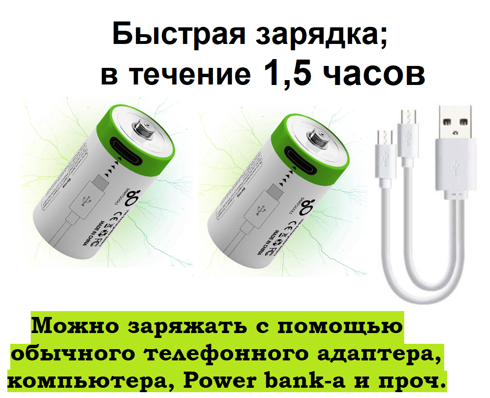 Аккумуляторы LI-ion Тип D-2 шт. (D20, LR20) емкость 12000 mWh 1.5V заряжаемый от кабеля USB Type-C быстрой зарядкой.