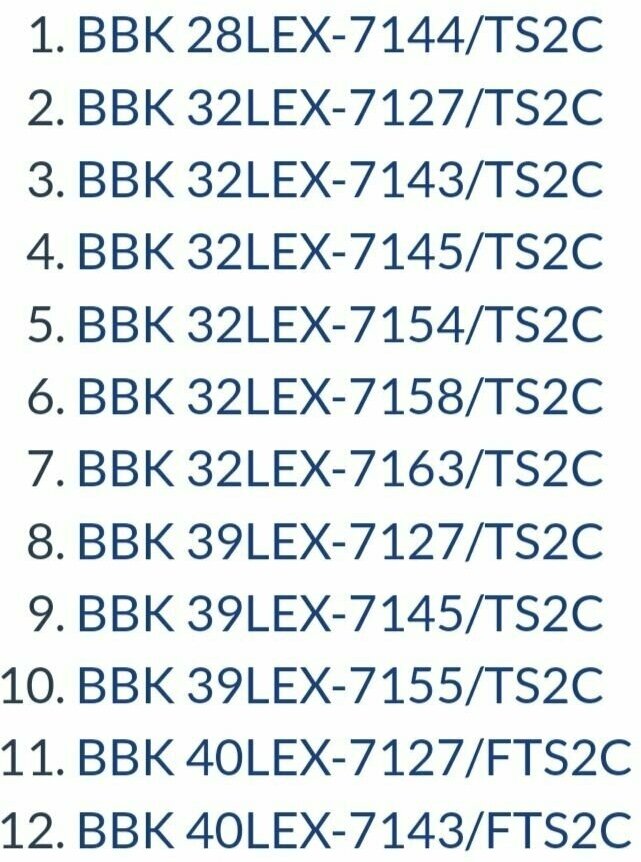 | Назначение | BBK 28LEX-7144/TS2C, BBK 32LEX-7127/TS2C, BBK 32LEX-7143/TS2C, BBK 32LEX-7145/TS2C, BBK 32LEX-7154/TS2C, BBK 32LEX-7158/TS2C, BBK 32LEX-7163/TS2C, BBK 39LEX-7127/TS2C, BBK 39LEX-7145/TS2C, BBK 39LEX-7155/TS2C, BBK 40LEX-7127/FTS2C, BBK 40LEX-7143/FTS2C, BBK 40LEX-7158/FTS2C, BBK 43LEX-7127/FTS2C, BBK 43LEX-7143/FTS2C, BBK 43LEX-7158/FTS2C, BBK 43LEX-8161/UTS2C, BBK 50LEX-7143/FTS2C, BBK 50LEX-7158/FTS2C, BBK 50LEX-8127/UTS2C, BBK 50LEX-8156/UTS2C, BBK 50LEX-8158/UTS2C, BBK 50LEX-8161/UTS2C, BBK 55LEX-8127/UTS2C, BBK 55LEX-8145/UTS2C, BBK 55LEX-8158/UTS2C, BBK 55LEX-8161/UTS2C, BBK 65LEX-8127/UTS2C, BBK 65LEX-8139/UTS2C, BBK 65LEX-8161/UTS2C, BBK 43LEX-7174/FTS2C |