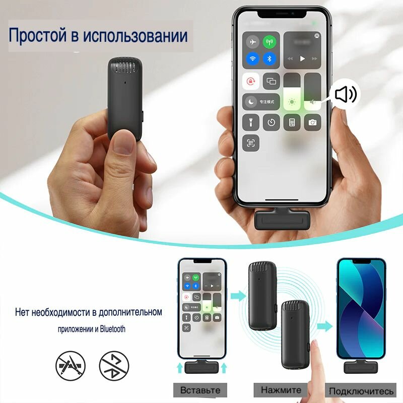 Микрофон петличный беспроводной, с шумоподавлением, петличка, для мобильного телефона, разъем Lightning, для Iphone, черный, 2шт