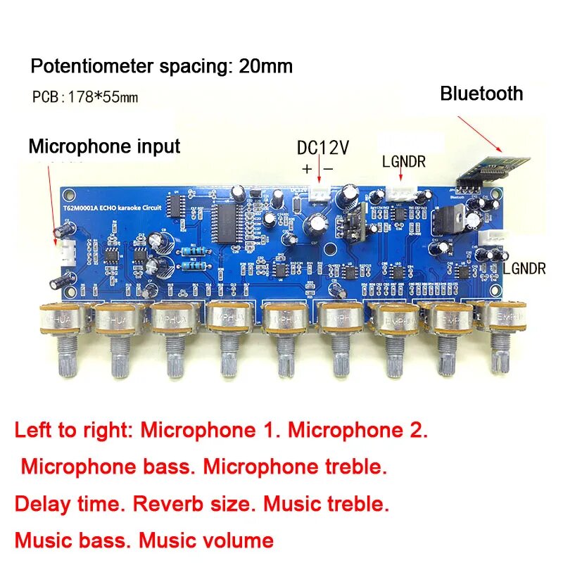 Предусилитель T62M0001A для караоке, OK, реверберационная плата, предусилитель тона, плата, регулятор басов, стерео музыкальный усилитель, Bluetooth, with Bluetooth