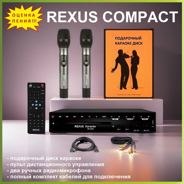 REXUS "COMPACT" - комплект караоке начального уровня для дома, 2 радиомикрофона, HDMI, Оценка Пения интересное: