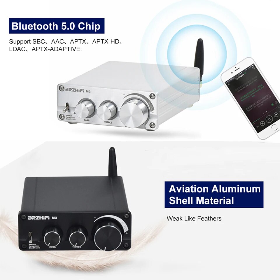Усилитель BRZHIFI Bluetooth 5,0 QCC5125 MA12070 2*80 Вт 2.1 Power HD Audio AUX APTX APTX-HD HiFi Mini Amp DIY стерео домашний кинотеатр, Серебристый