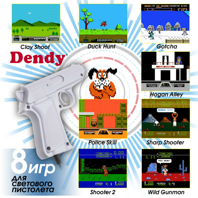 | Дополнительная информация | Комплектация: 1. Игровая консоль – 1 шт. 2. Джойстики – 2 шт. 3. Световой пистолет – 1 шт. 4. Блок питания 9В - 1 шт. 5. Кабель AV Dendy RCA - 1 шт. 6. Инструкция по эксплуатации – 1 шт. |