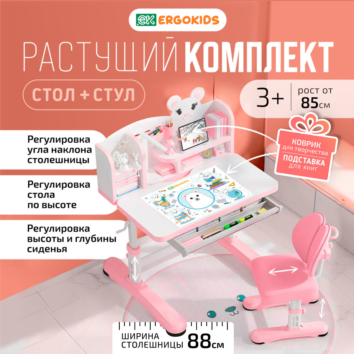 СохранитьРастущий стол парта и стул детский набор Ergokids Panda XL BD-29 розовый интересное: