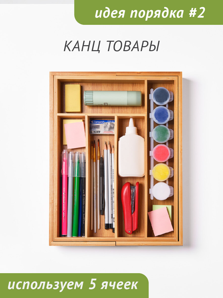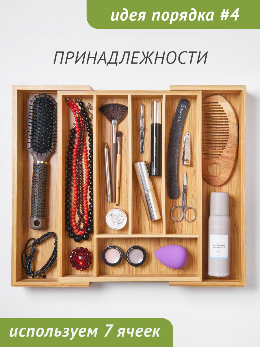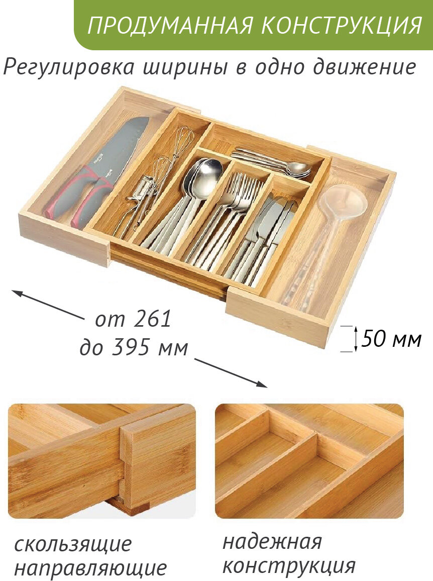 Раздвижной лоток для столовых приборов из бамбука 7 ячеек, DOUBLE GREEN интересное:
