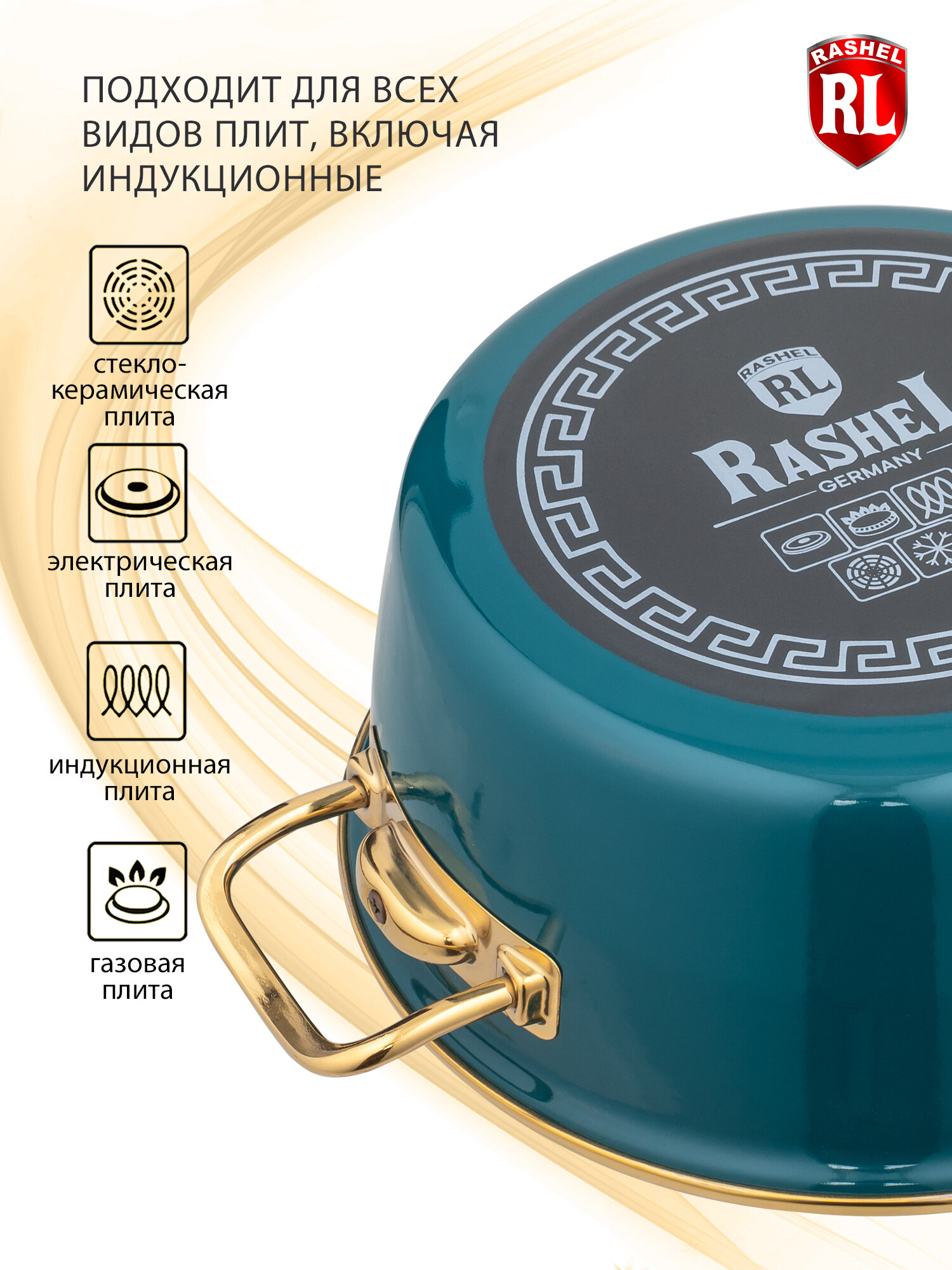 Кастрюля 2,6л Rashel Grand R0920 эмаль, ст.крышка, ручка золото; кремовый, индукция