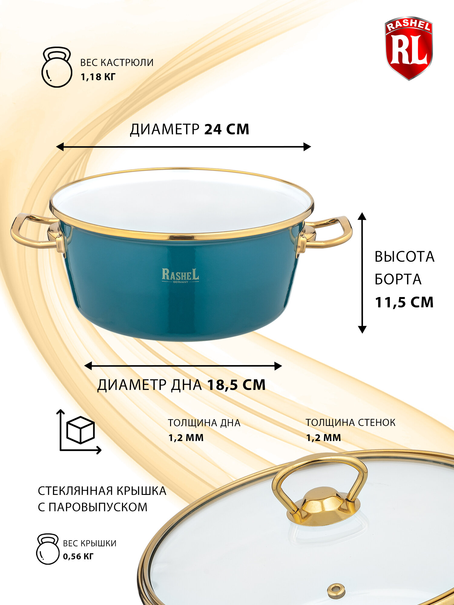 Кастрюля Rashel Grand R0820 2,6л эмаль, ст.крышка, ручка золото; графитовый