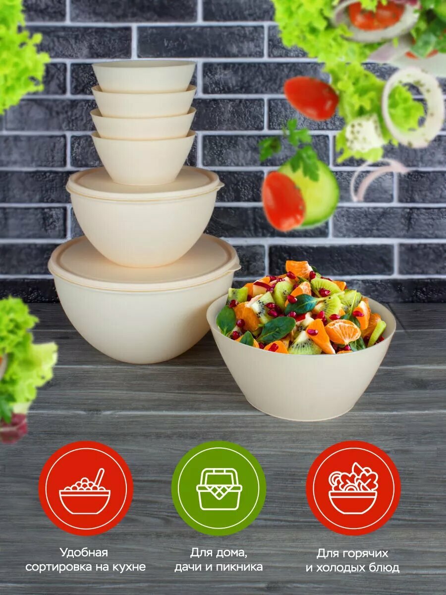 | Комплектация | миски с крышкой 4л-1шт; 2л-1шт; салатники без крышек- 2,5л- 1шт; 0,6л- 2шт. |