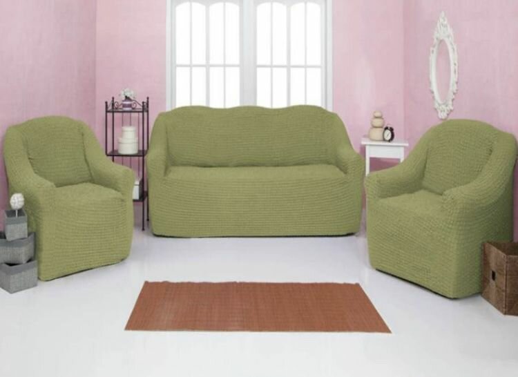 Комплект чехлов для мягкой мебели диван и 2 кресла без оборки, универсальный, на резинке.