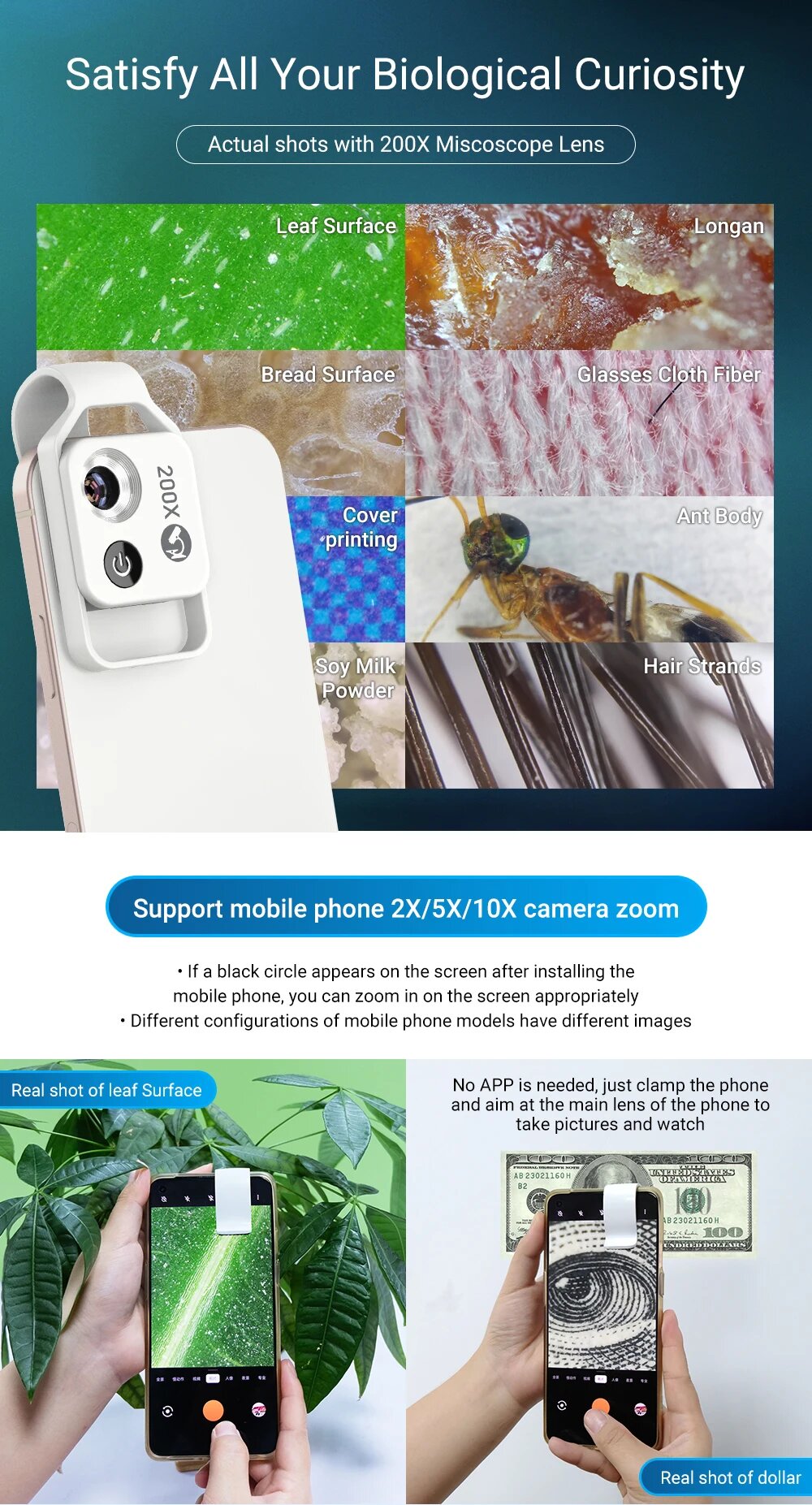 Купить Цифровой микроскоп APEXEL 200X, объектив с мобильным светодиодным индикатором CPL, микрокарманные макролинзы для iPhone, Samsung, всех смартфонов, Black with CPL