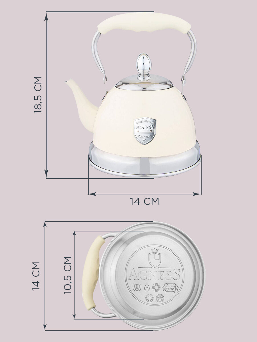 Чайник со свистком Agness 3л, индукционное капсульное дно, молочный, нержавеющая сталь