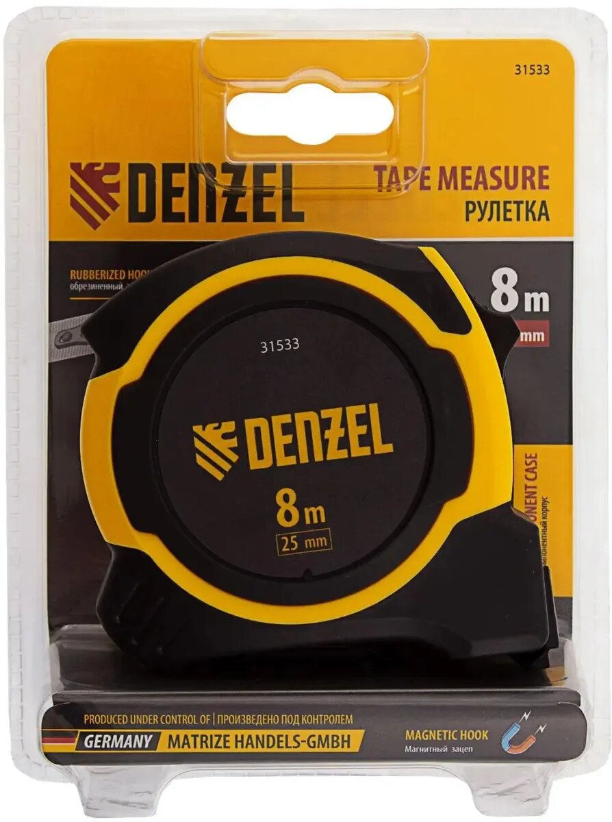 Рулетка 8м х 25мм, двухкомп. корпус, магнитный обрезиненный зацеп// Denzel 31533