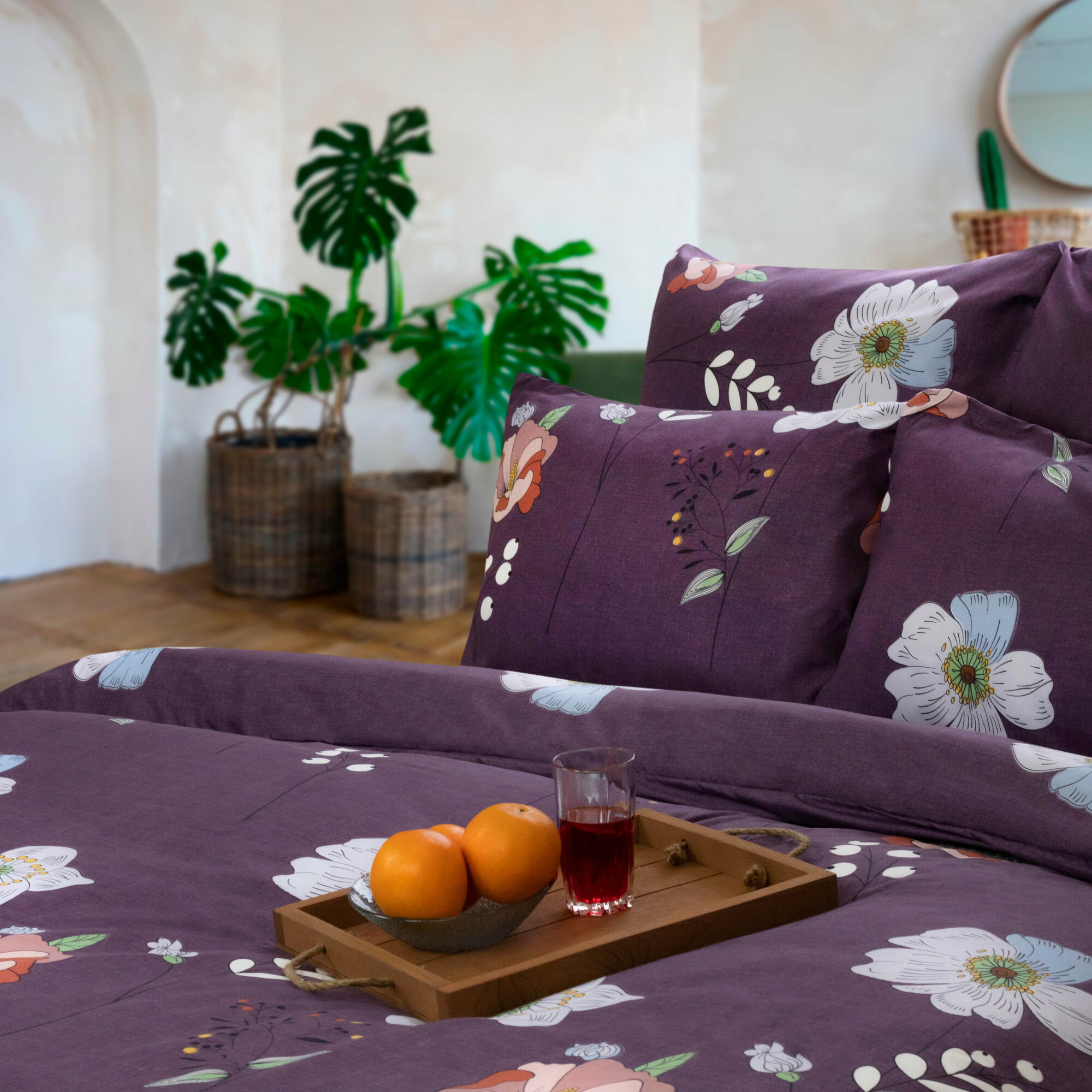 Постельное белье семейное с цветочным принтом Cleo Art Color, комплект из полисатина с двумя пододеяльниками