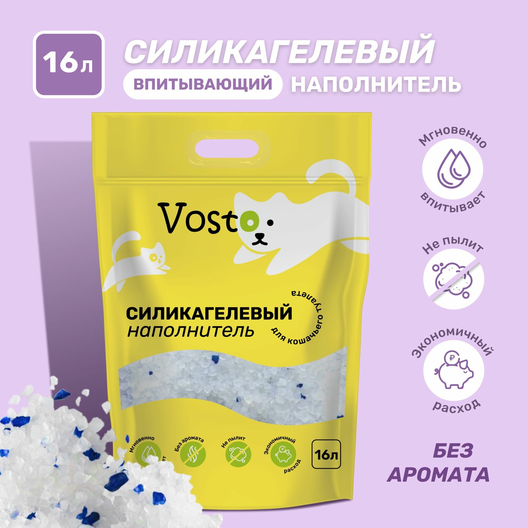 Купить Наполнитель для кошачьих туалетов Vosto, силикагель, впитывающий, без аромата, антибактериальный, 16л
