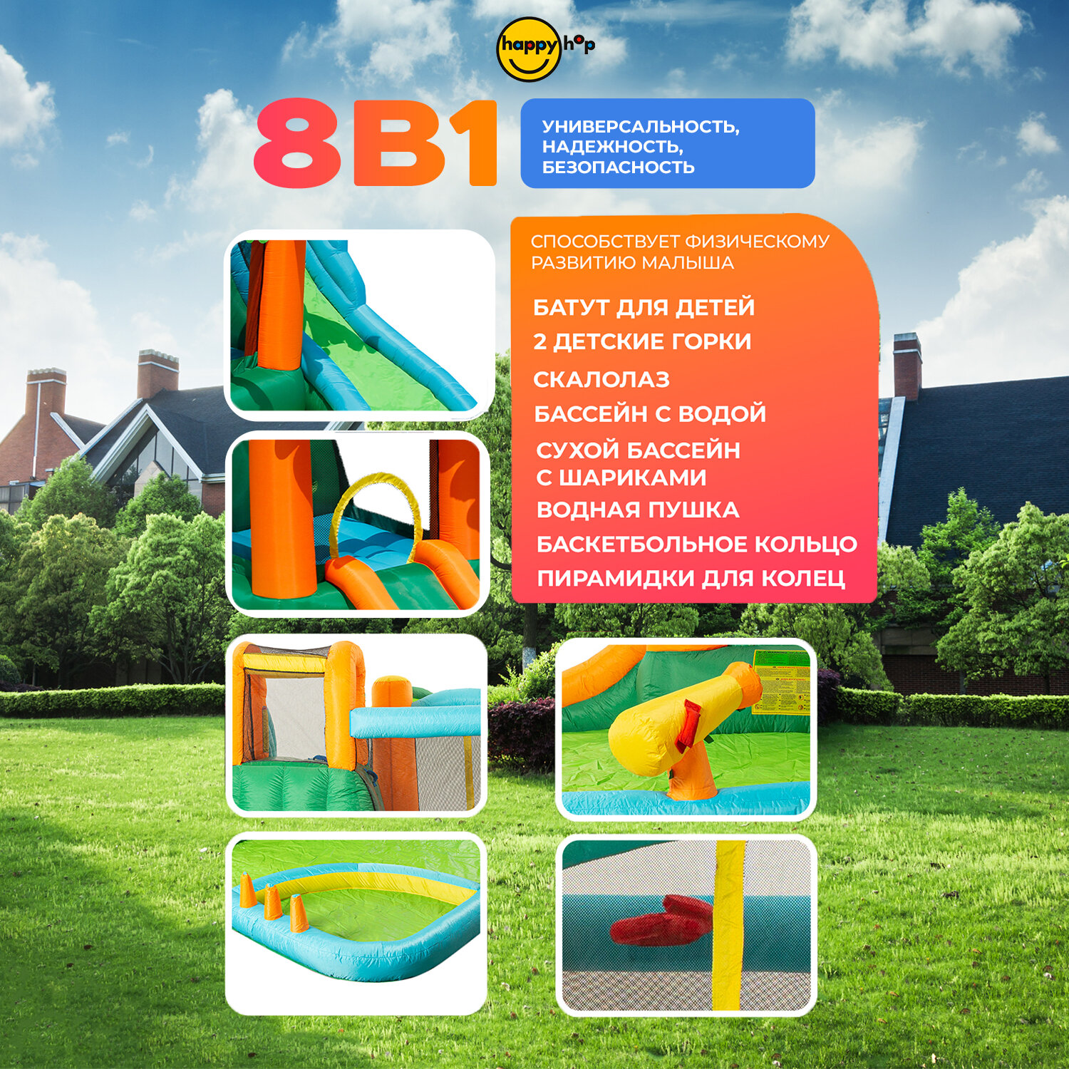 Детский надувной батут для дома и улицы Happy Hop "Тропикана 2", с горкой, бассейн, с защитной сеткой, 430х375х205 см интересное: