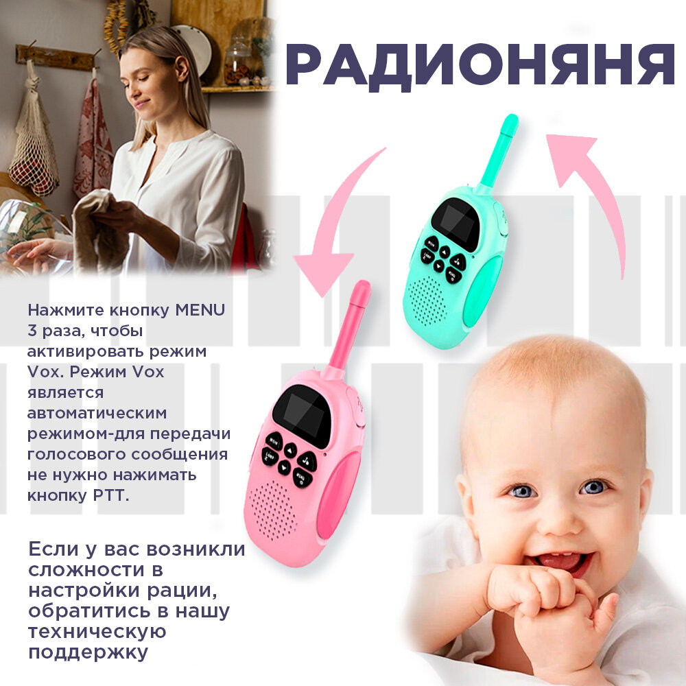 KIBERLI H1 Комплект игровых раций для детей 10 мелодий, радионяня дальность 3 км. Детские рации, розовый, бирюзовый