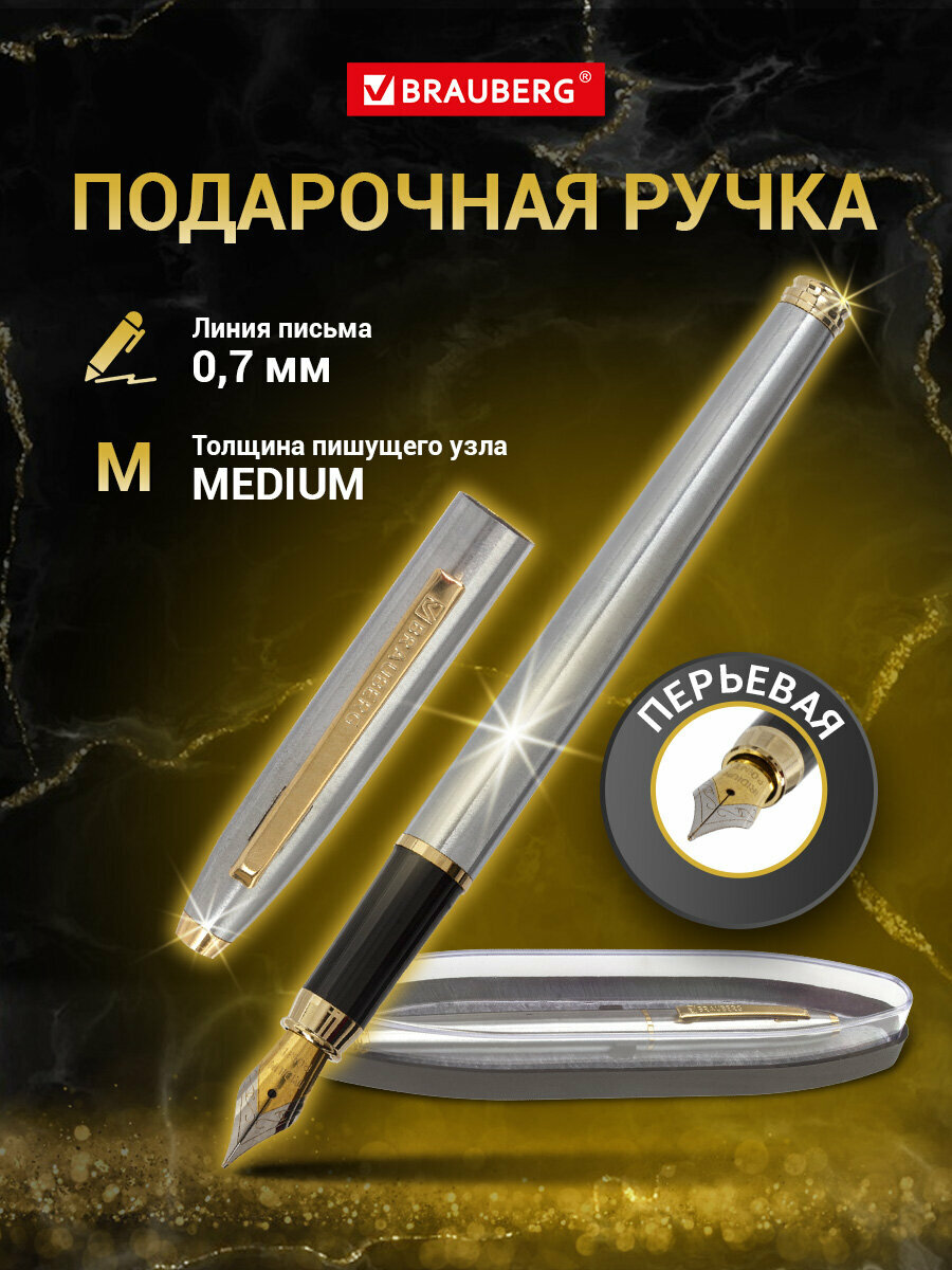 Ручка подарочная перьевая BRAUBERG Maestro, синяя, корпус серебристый с золот, линия 0,25мм,143469