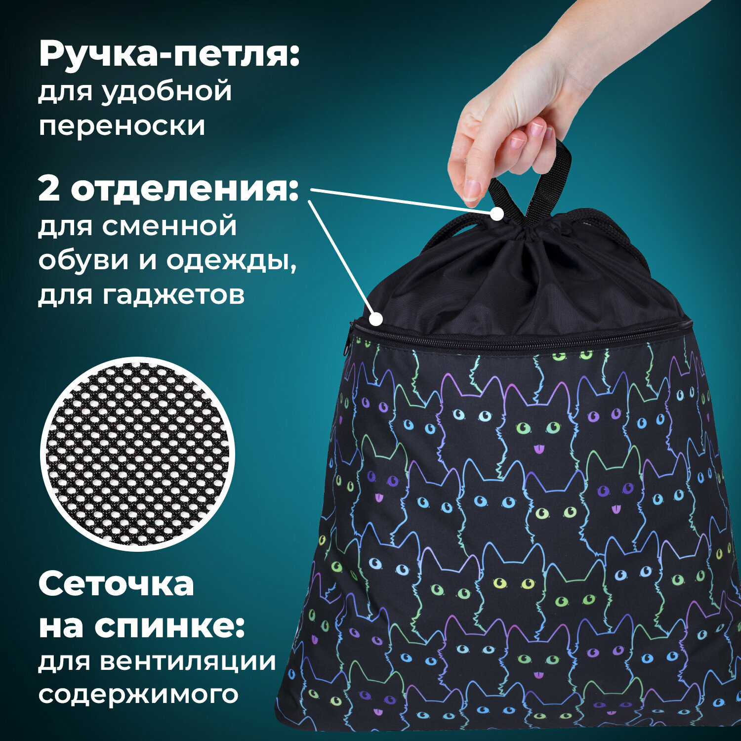 Сумка / мешок / рюкзак для сменной обуви (сменки) Brauberg, карман на молнии, с ручкой, сеточка для вентиляции, 51х41 см, Cats