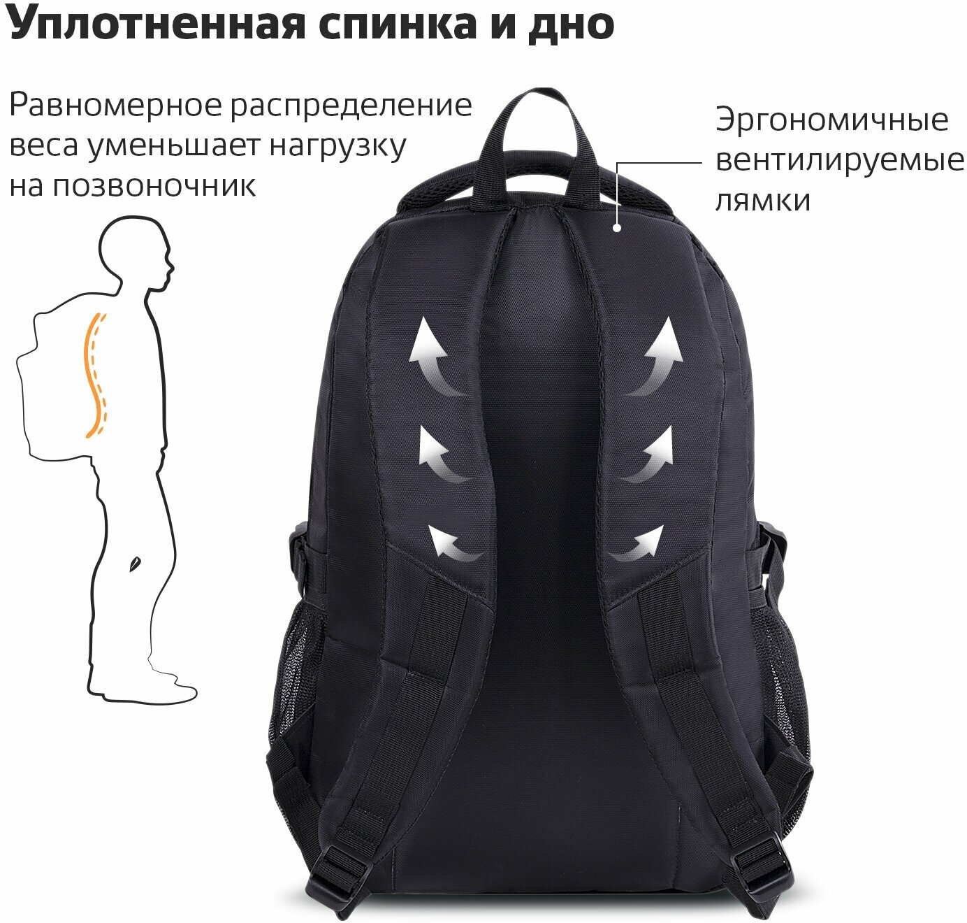 Рюкзак женский мужской, школьный спортивный городской, для подростка черный, 3 отделения, 46х31х18 см, Brauberg High School, 270758