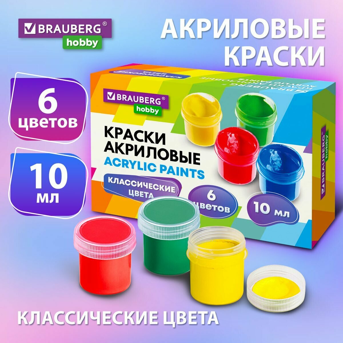 Комплект 6 шт, Краски акриловые для рисования и творчества 6 цветов по 10 мл, BRAUBERG HOBBY, 192432