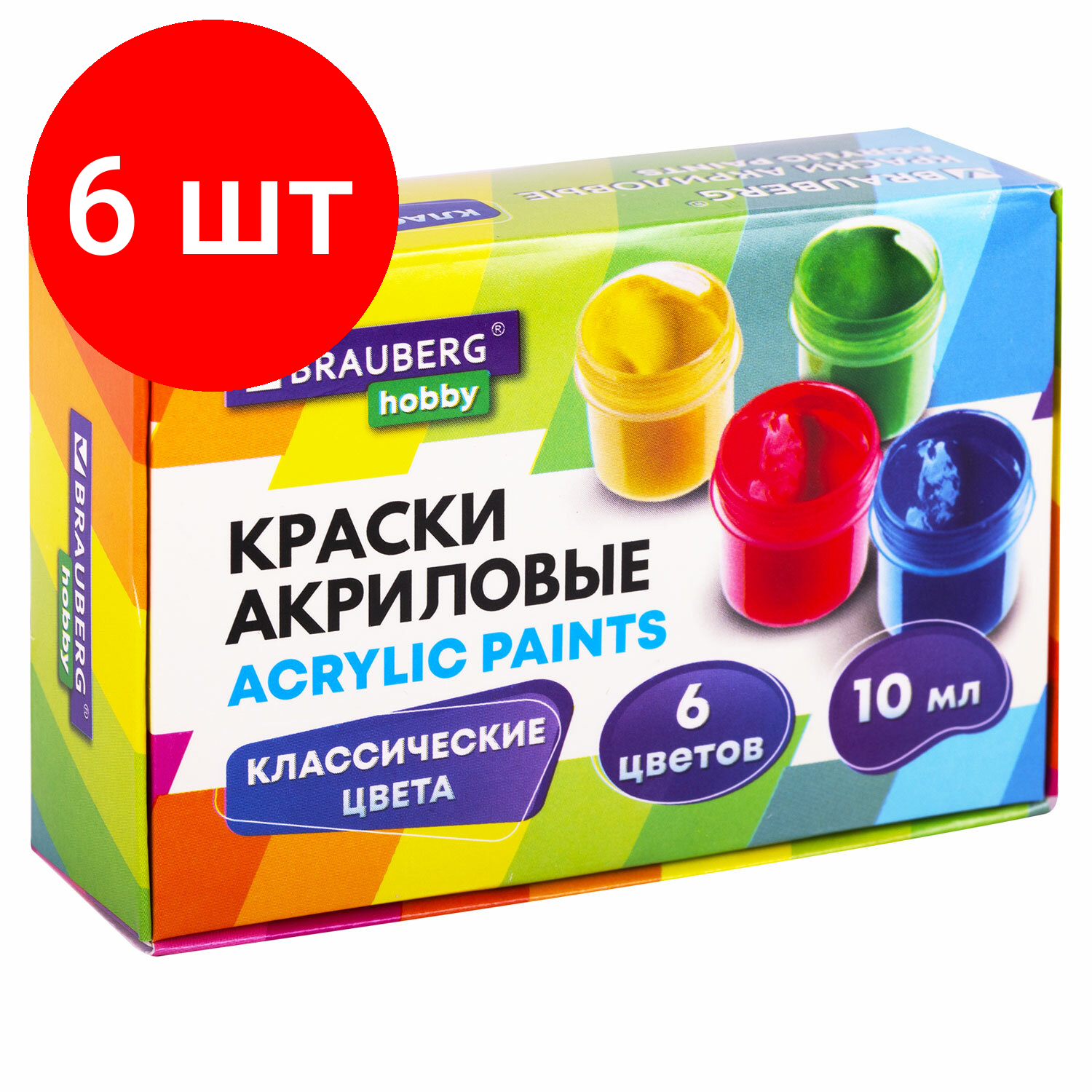 Краски акриловые 6 цветов Brauberg Hobby, по 10мл (192432)