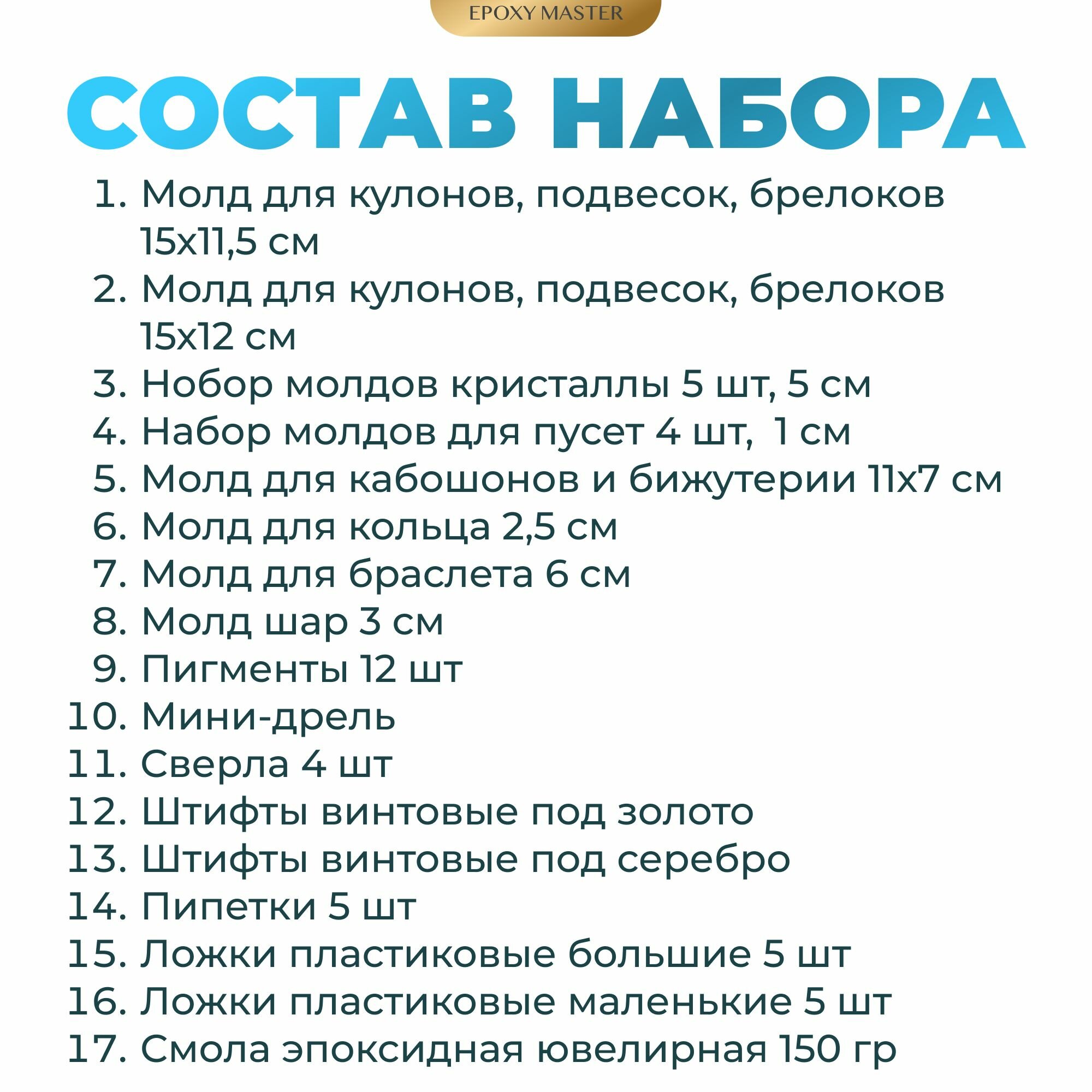| Комплектация | Силиковые молды для создания украшений, силиконовый молд Шар, Ювелирная эпоксидная смола 150г, Силиконовые палочки 5 штук, Пипетки 5 штук, Мини-дрель для бижутерии, Штифты для бижутерии, Набор для создания колец, Глиттеры 12 штук |