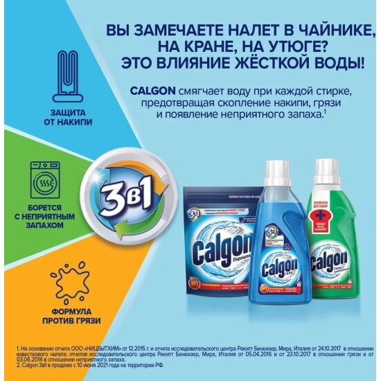 Средство от накипи Calgon для стиральной машины 3в1, антинакипин для смягчения воды, гель от неприятного запаха, 1,5 л