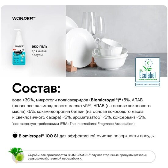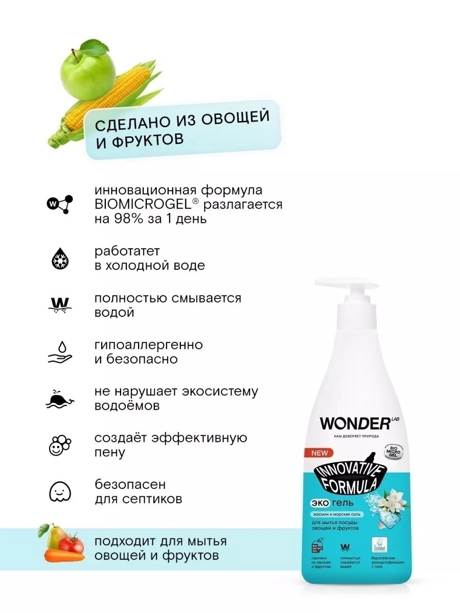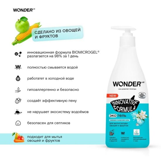 WONDER LAB Экогель для мытья посуды, овощей и фруктов Жасмин и Морская соль, 550 мл, 2 ШТ