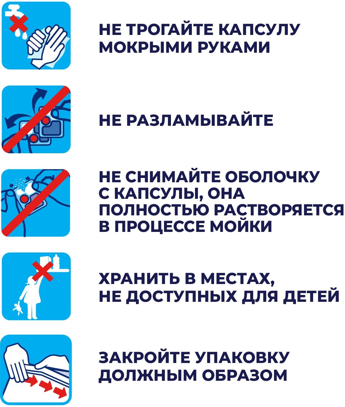 | Способ применения | Поместите 1 таблетку в сухой отсек на 1 цикл мойки. При выборе коротких циклов кладите таблетку на дно вблизи фильтра. |
