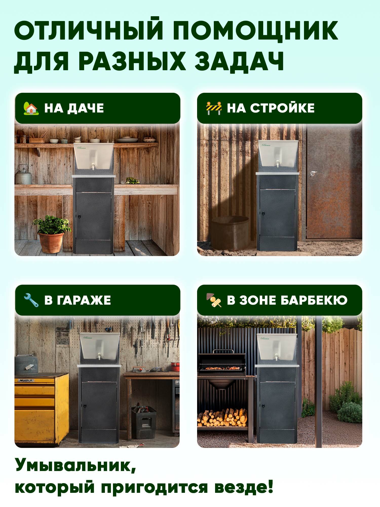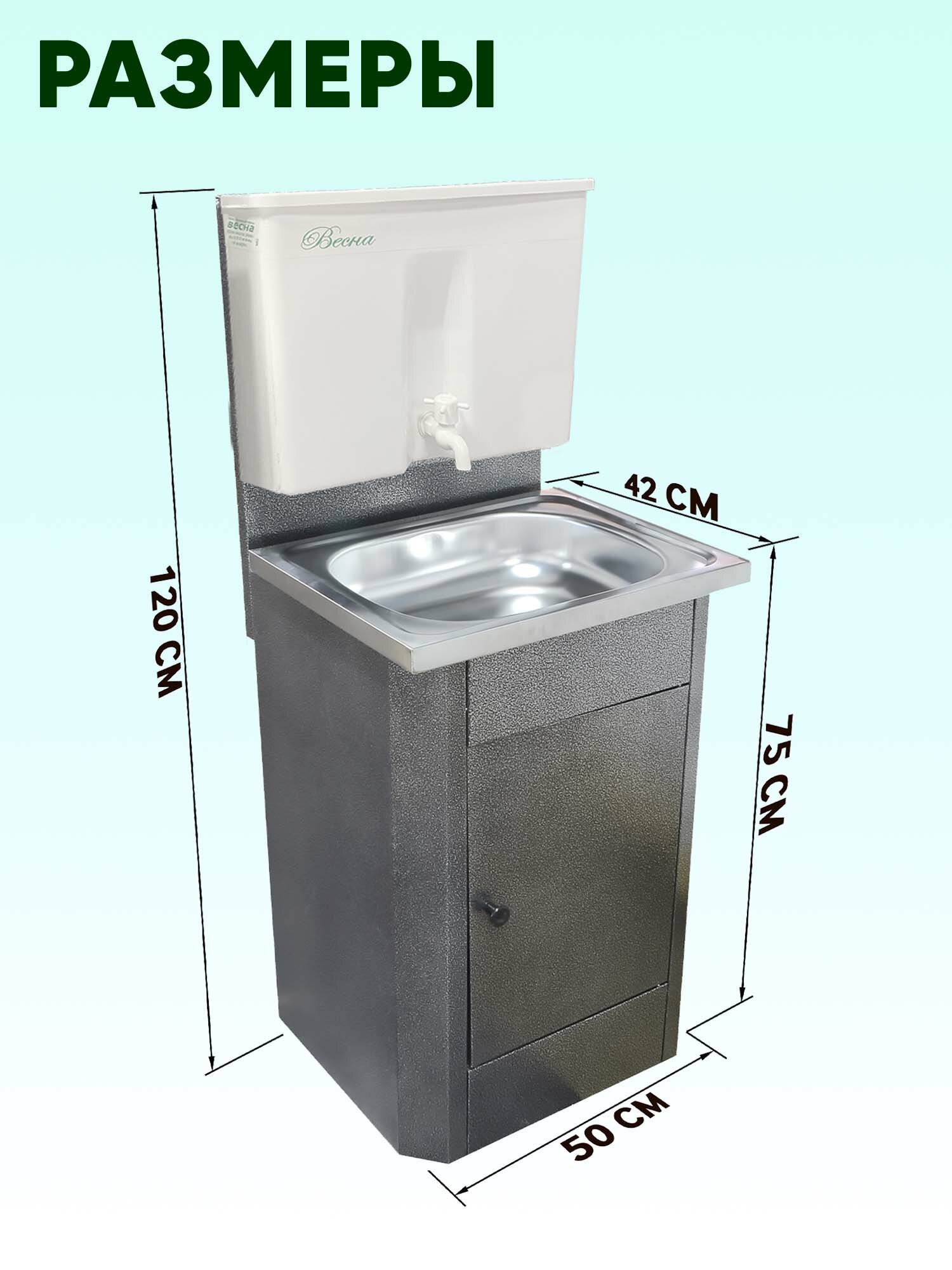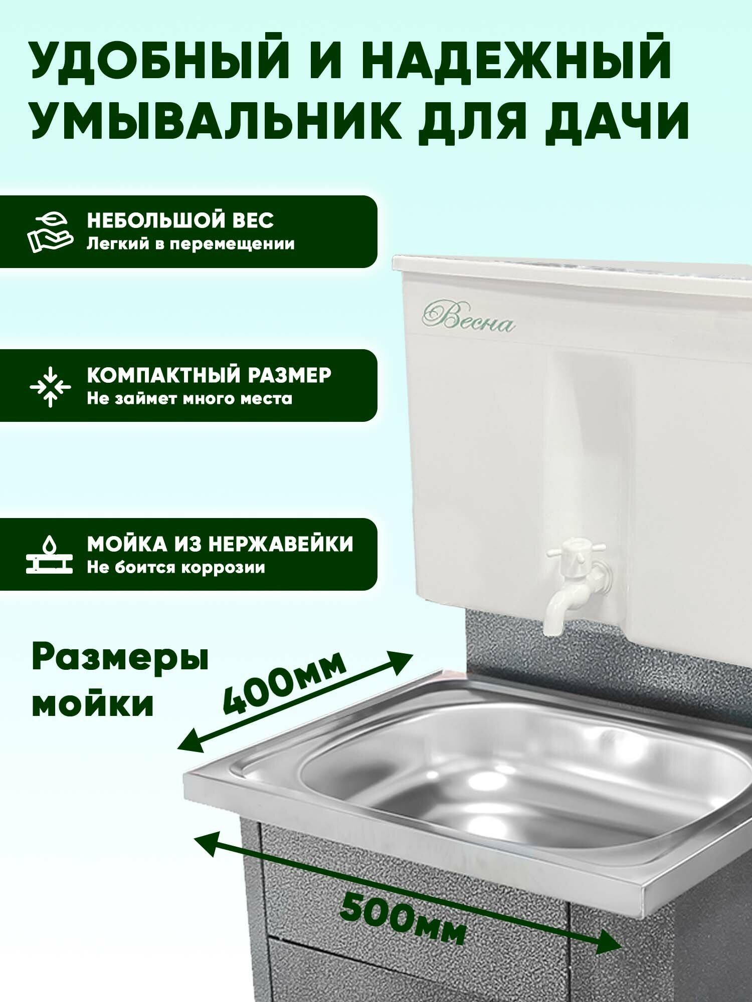 СохранитьУмывальник дачный "Весна" без подогрева, тумба, пластмассовый бак, нержавеющая мойка, цвет серебро интересное: