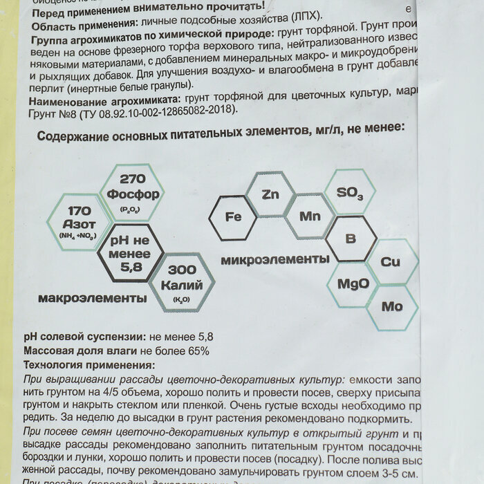| Основные питательные вещества в мг/л, не менее | 150мг/л - азот NH4+NO3; 300мг/л - калий К20; 270мг/л - фосфор Р2О5; солевой суспензии 6,0-6,5рН |