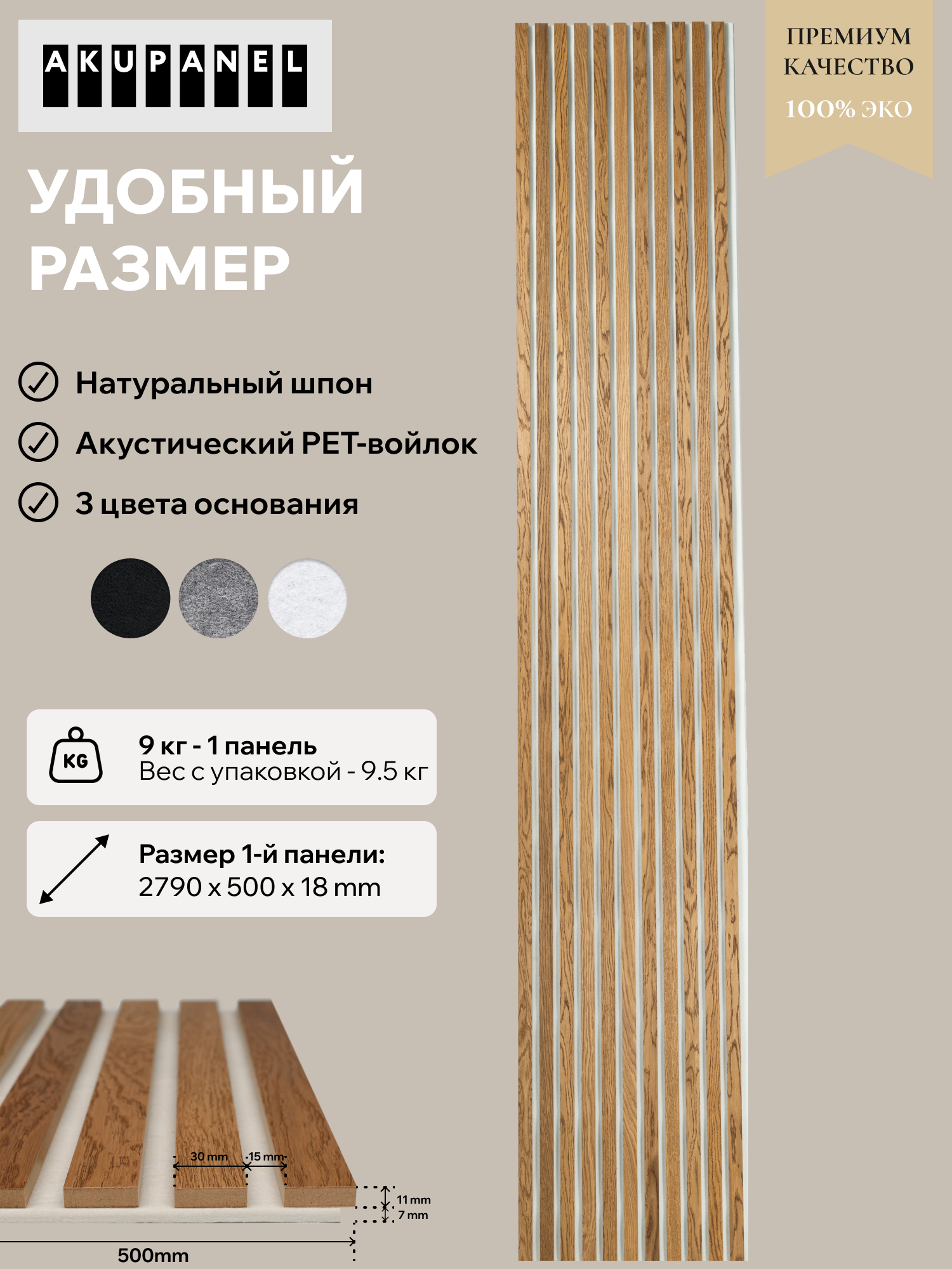 Акустическая реечная панель AKUPANEL - Декоративные рейки (Шпон, Дуб "Бурбон") и серая акустическая панель Акупанель