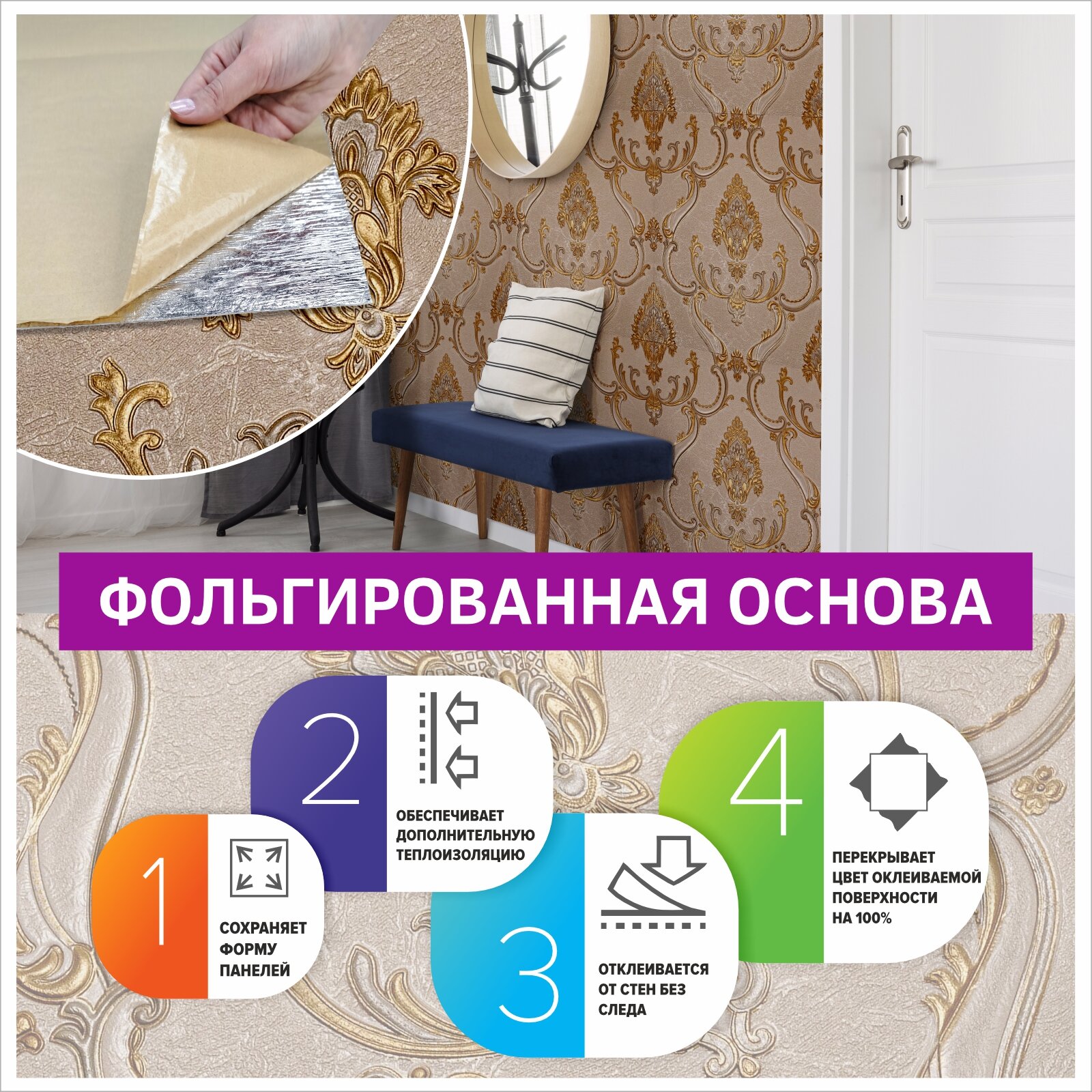 Самоклеющаяся панель для стен мягкая с фольгой "Вензель серебристый" 10 шт. 3D 690*690*4 мм 3Д обои для кухни моющиеся фартук на стену