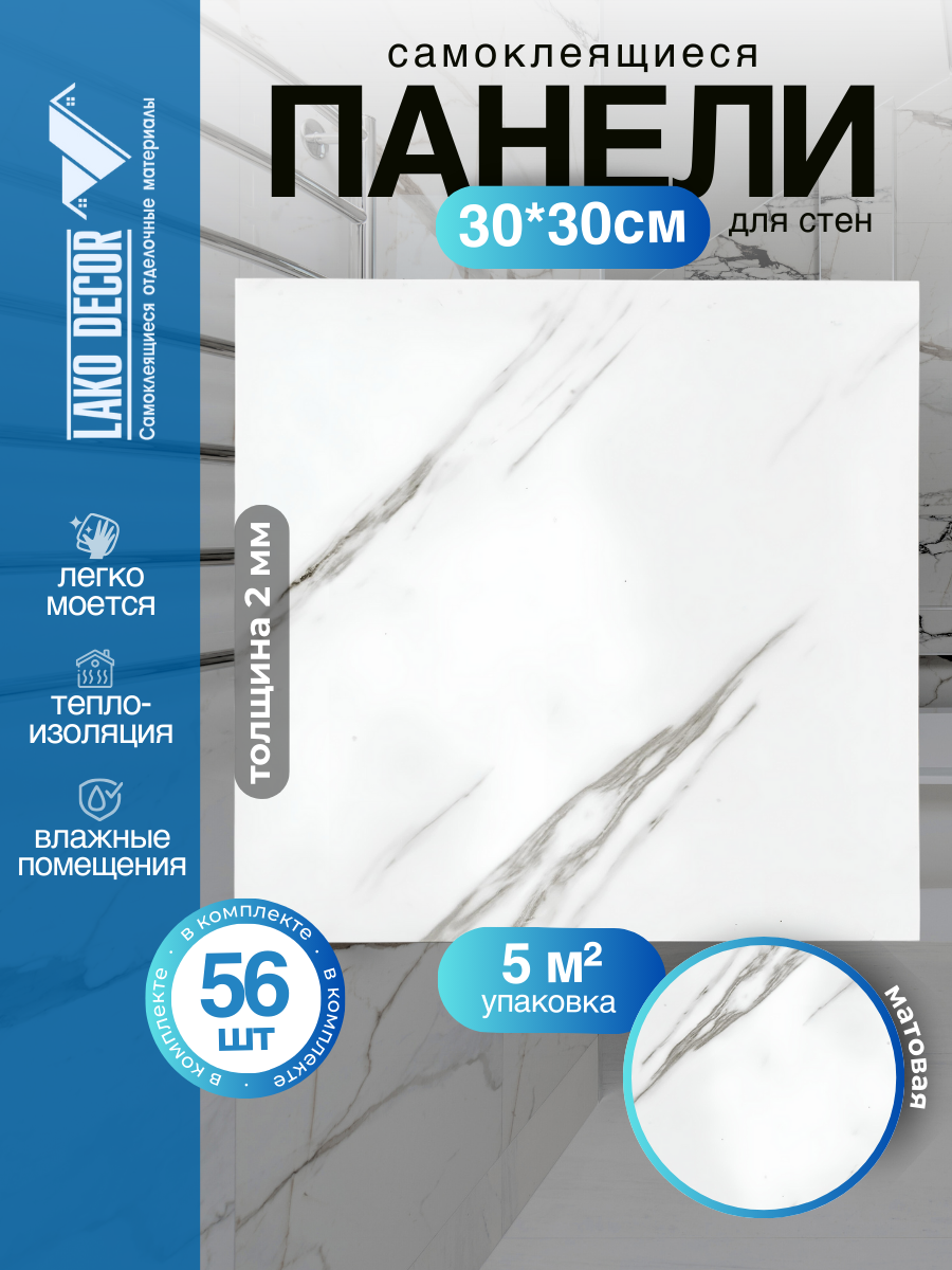 Мега-комплект 56 шт. Самоклеящейся ПВХ плитки LAKO DECOR "Белый мрамор", толщина 2мм, 5м²
