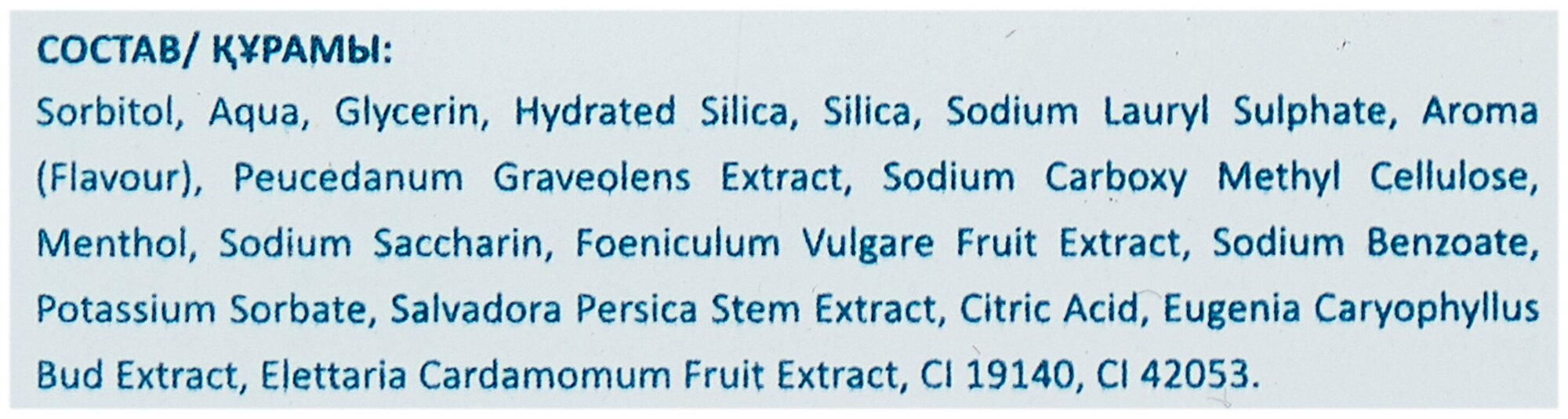 | Состав | aqua, cellulose gum, ci 19140, ci 42053, citric acid, elettaria ardamomum fruit extract, eugenia caryophyllus bud extract, flavour, foeniculum vulgare fruit extract, glycerin, hydrated silica, menthol, peucedanum graveolens extract, potassium sorbate, salvadora persica stem extract, silica, sodium benzoate, sodium lauryl sulphate, sodium saccharin, sorbitol |