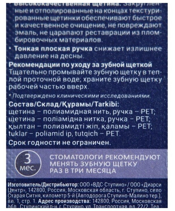 | Дополнительная информация | скошенная подстрижка щетины позволяет зубной щётке проникать в труднодоступные места и к дальним зубам. Благодаря технологии тройной полировки кончиков щетинки идеально закруглённые и гладкие, поэтому безопасны для дёсен.Тонкая лёгкая ручка из безопасного высококачественного пластика предотвращает излишнее давление при чистике. Кроме того, её гладкая поверхность без дополнительных деталей препятствует размножению бактерий, что обеспечивает гигиеничность щётки |